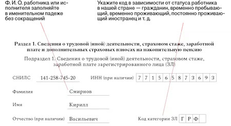 В каждом разделе есть несколько подразделов. Например, подраздел 1.1. раздела 1 — сведения о трудовой деятельности. Подраздел 1.2 раздела 1 и подраздел 2 — сведения о стаже. Это разделы, которые заменили привычные отчёты в ПФР. Логично, заполнять их должны кадровые специалисты. Как ясно из названий разделов, ЕФС-1 заменит собой четыре формы: СЗВ-ТД, СЗВ-СТАЖ, ДСВ-3 и 4-ФСС. Последний раз их нужно будет сдать за периоды 2022 года. Важно! СЗВ-М с 2023 года сдавать тоже не нужно. Персонифицированные сведения о физических лицах страхователи будут ежемесячно направлять в ФНС, а налоговая передаст данные в СФР. Ничего сверхнового в ЕФС-1 не появится. Структура ее разделов очень похожа на ранее действующие формы. Подразделы 1.1, 1.2 и 2 раздела 1 заполняют и сдают все работодатели, у которых есть наемные работники. Сведения подают в том числе на совместителей, дистанционных и надомных работников, исполнителей договоров ГПХ, на вознаграждение по которым начисляют страховые взносы. И, так из выше сказанного понятно, направлять форму ЕФС-1 в объединенный фонд СФР можно будет в бумажном и электронном виде. В цифровой форме сдавать отчёт будут работодатели, среднесписочная численность которых с учётом исполнителей по ГПД, превышает 10 человек. Остальные могут сами решить, как сдавать отчёт — на бумаге или в цифре. Если сдаёте отчёт на бумаге, используйте чернила или шариковую ручку черного, фиолетового или синего цвета. Данные вносите печатными буквами. Исправлять и сокращать нельзя. Бесплатно сдать отчетность во все контролирующие органы через оператора ЭДО. Титульный лист заполнять обязательно, независимо от того, какие разделы или подразделы сдаёт специалист. На титульном листе два подраздела: Кадровая служба заполняет раздел 1. Порядок устанавливает, что сведения по форме ЕФС-1 в подразделе 1.1 подраздела 1 работодатели подают: В сведениях о сотруднике формы укажите: Про новшество — код застрахованного лица. Отдельные коды будут использоваться для сотрудников-россиян и сотрудников-иностранцев разных категорий. Все новые коды — ниже. Узнать КПП, ОКВЭДы и другие коды ООО или ИП. Форму сдавайте, только если в отчётном месяце по сотруднику были кадровые изменения. Например, сотрудника приняли, перевели на другую должность или уволили, либо сотрудник подал заявление о выборе формата трудовой. Если кадровых изменений не было, то форму на этого сотрудника в отчётном месяце не подавайте. Подавайте форму, если заключили или прекратили договор ГПХ. Когда подаете отчёт об увольнении сотрудника, включите также в него сведения о других кадровых изменениях в отчетном месяце, если месяц ещё не закончился, либо сведения за предыдущий отчетный месяц, если их еще не подавали. Заполнить раздел нужно, если сотрудник в течение месяца подал заявление о желании сохранить бумажную трудовую книжку или перейти на электронные сведения. Укажите дату подачи заявления в формате ДД.ММ.ГГГГ. Сведения о трудовой деятельности работника в форме ЕФС-1 заполняйте по алгоритму: Учтите, если компания сменила название, запись об этом нужно будет внести в ЕФС-1 отдельной строкой. Для этого в графе 2 пропишите дату, с которой изменилось наименование, а в графе 3 укажите «ПЕРЕИМЕНОВАНИЕ». Далее в графе 5 пропишите, что «старое наименование» с конкретного числа переименовано в «новое наименован