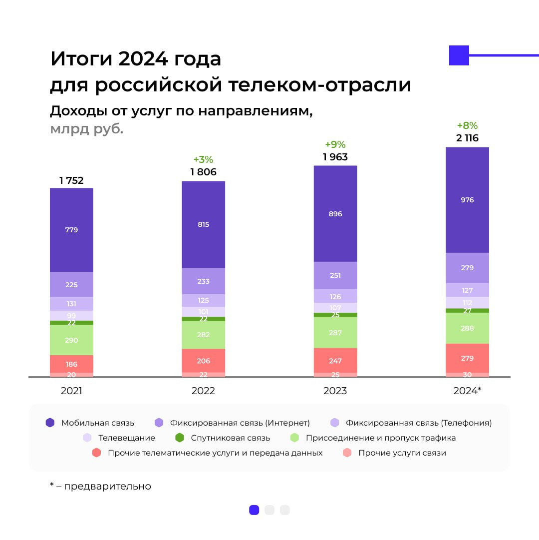 ⚫️ Основным драйвером роста выступают услуги мобильной связи. В прошлом году сегмент достиг 976 млрд рублей, увеличившись на 8,9%