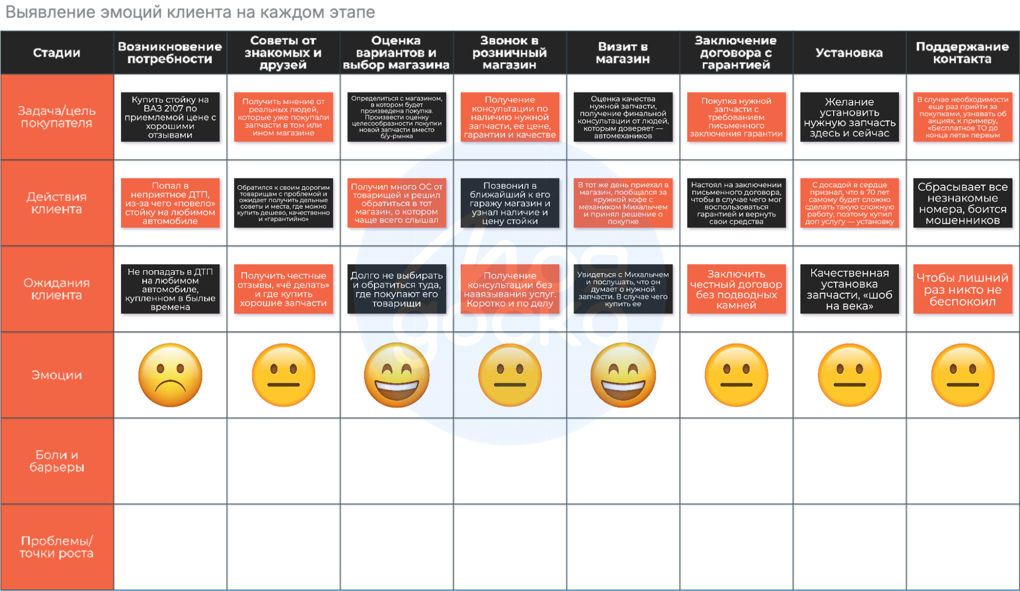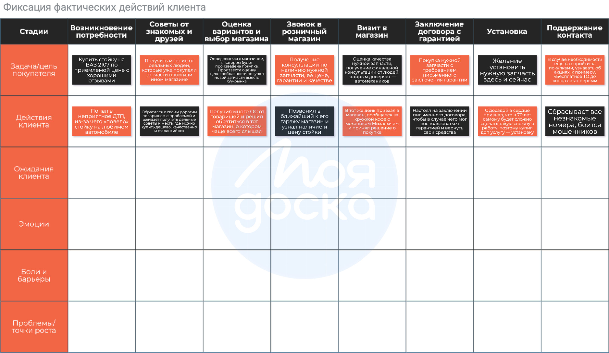 Зачастую предприниматели и компании не замечают пусть и небольших, но очень значимых деталей для своих клиентов. К примеру, домохозяйка не заказывает доставку продуктов на дом, потому что в приложении сервиса нет опции, чтобы курьер оставил заказ у двери без звонка в дверь, ведь она может укладывать ребенка спать во время доставки. Для создания работающей «карты» необходимо проследить за поведением клиента на всех этапах его взаимодействия с вами. В самом конце найдете отличный шаблон для заполнения Это должен быть тот человек, которому нужен и интересен ваш продукт. Образ обязан быть максимально точным. К примеру, так может выглядеть портрет покупателя магазина автомобильных запчастей: Ни в коем случае не берите данные о своих клиентах из головы! Ваше представление о них не равно реальность. Сделайте анализ CRM, проведите глубинные интервью или опросы на собственном сайте. Сделайте все, чтобы иметь достоверный портрет своего клиента. Так же обращаем ваше внимание на то, что для полноты картины вам потребуется составить не один, и не два портрета. К примеру, в том же автомобильном магазине молодым ребятам может быть проще заказывать ступицу на Жигули напрямую с вашего сайта, а пенсионеру может потребоваться уважительная и подробная консультацию по телефону. Очень важно определить, в каких каналах ваши клиенты с вами взаимодействуют. Это могут быть как онлайн, так и офлайн каналы. Ниже пример нашего несчастного дедушки из Саратовской области, у которого после ДТП повело стойку на его любимой «семерке» (для вас аналогичный пустой шаблон подготовлен тут) Понимание ожиданий и действий клиента помогает собрать пользовательский опыт, и четче понять, что именно улучшить в нынешних процессах. Обратите внимание на различия между действиями и ожиданиями клиента. На основе этих различий будет необходимо выявить боли и барьеры между вами и вашим клиентом. Советуем делать недалеко от шаблона CJM. К примеру, на демонстрационной доске мы сделали это в фрейме справа. Так различия становятся более наглядными, а их решение выглядит более очевидным. Такая, казалось бы, незначительная вещь очень здорово поможет вам в приоритизации различных направлений. Вот пример эмоций нашего дедушки: Определите и зафиксируйте все трудности и препятствия, которые мешают клиенту взаимодействовать с вами. Это может быть как отсутствие парковки рядом с точкой, так и раздражающая назойливость звонков в рабочее время. Дополнительно можно ввести критерий оценки каждого этапа по важности, чтобы не тратить силы на итак работающие вещи. Собственно, то, зачем вы все сюда и пришли. Точки роста особенно легко напрашиваются, когда перед глазами у вас полная карта пути вашего клиента. От МЫСЛИ о проблеме до ее РЕШЕНИЯ. Вот, как можно улучшить пользовательский опыт: К примеру, после коллаборации с известным блогером у вас произошел наплыв совершенно новой аудитории, которой интересны ваши товары/услуги. В таком случае обязательно актуализируйте CJM. Чтобы нарисовать карту пользователя и представить ее руководителю, инвестору, команде, клиенту или партнеру, можно воспользоваться разными инструментами: Все иллюстрации в этой статье были созданы и экспортированы из сервиса МояДоска, ссылка на шаблон для создания вашей CJM-карты тут (ссылка) Спасибо что дочитали! Если возн