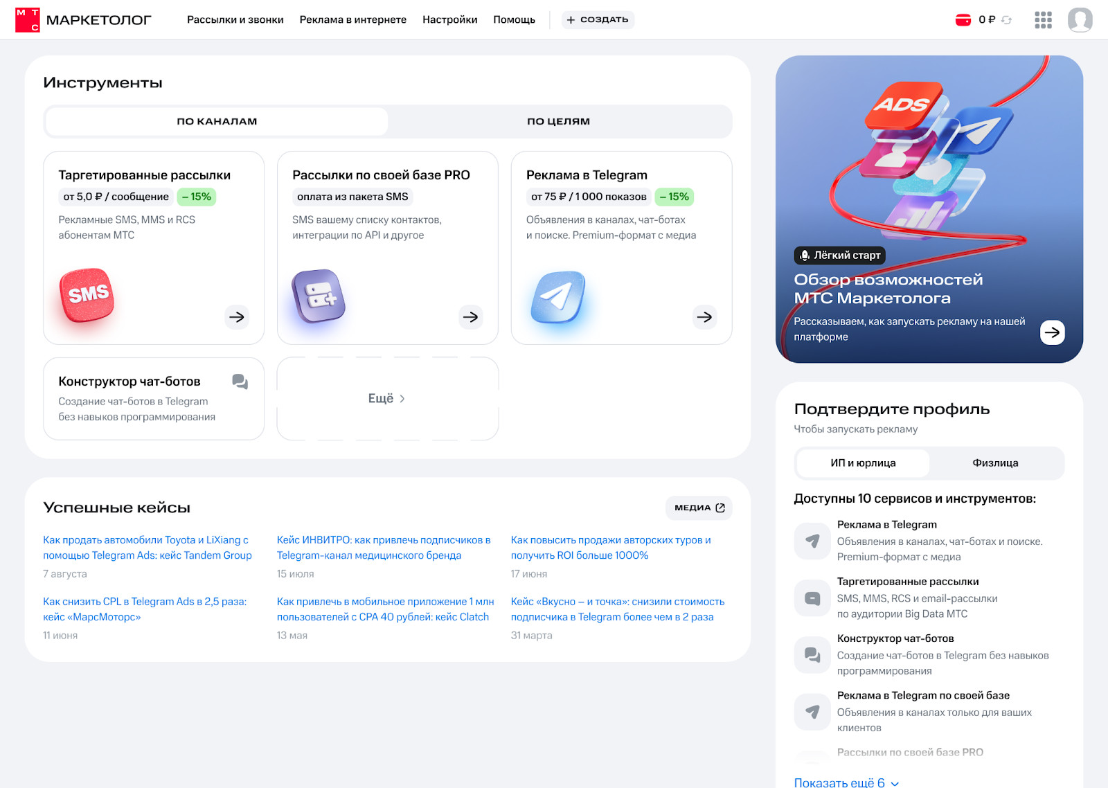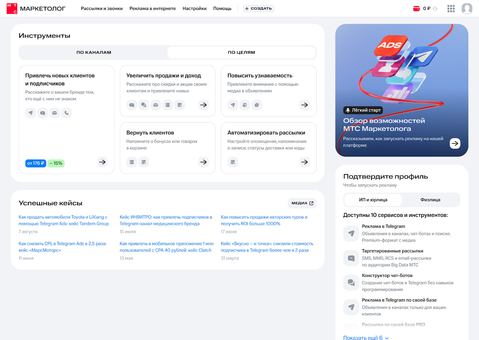 Теперь все инструменты МТС Маркетолога на главной странице структурированы по каналам и целям, что позволяет рекламодателю сразу выбрать наиболее подходящий сценарий запуска кампании. Внутри каждого раздела представлены крупные блоки запуска. Так, в разделе «По каналам» в одном из блоков доступен запуск таргетированных SMS/MMS/RCS-рассылок как на агрегированные и обезличенные сегменты Big Data МТС и партнеров, так и на собственную клиентскую базу. В другом — запуск рекламы в Telegram Ads в текстовых и премиум-форматах с баннером и видео без минимального порога бюджета для малого и среднего бизнеса.