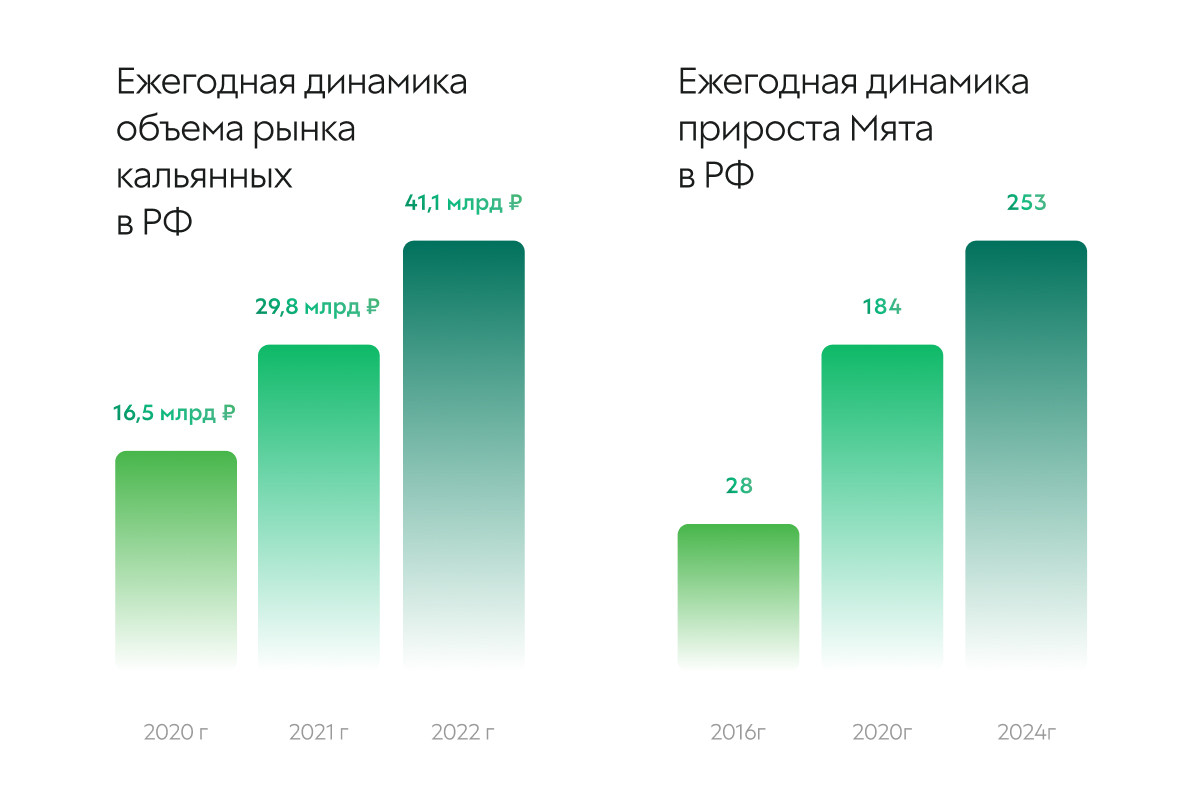 Мята — один из самых узнаваемых брендов кальянной индустрии. Согласно исследованиям нашего партнера, крупнейшего производителя табака, треть гостей лаунж-баров в России выбирают Мяту. Приобретая франшизу, наши партнеры открывают уже знакомое для людей место со сформировавшейся репутацией.