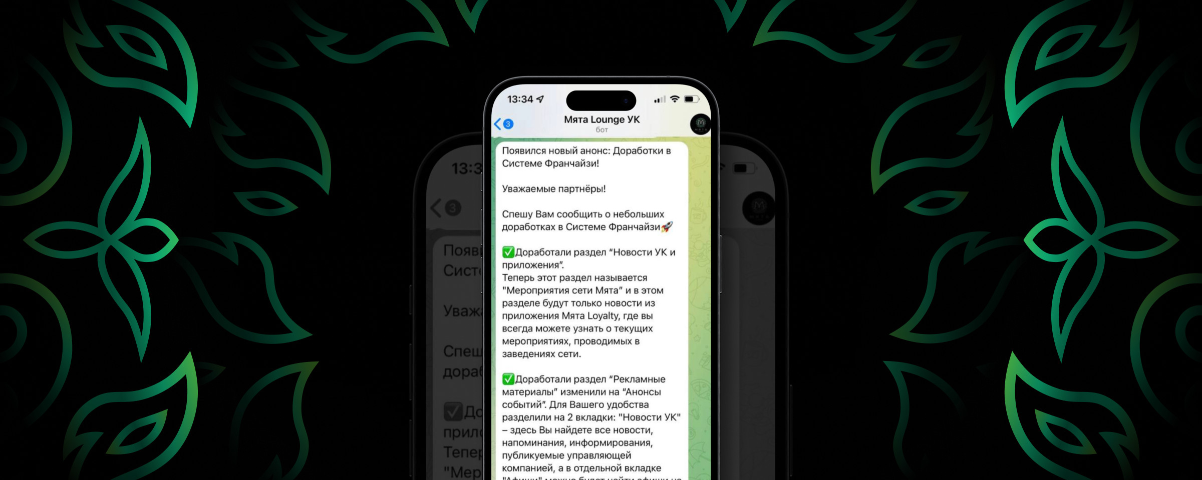 После заключения договора коммерческой концессии и оплаты паушального взноса для франчайзи открывается доступ к личному кабинету партнера в CRM. Здесь партнеры могут находить всю необходимую информацию в базе знаний, взаимодействовать с гостями, оплачивать роялти, получать поддержку от управляющей компании. Даже форму для сотрудников можно заказать прямо внутри системы. Остановимся подробнее на базе знаний. Она без преувеличения собрала в себе абсолютно все необходимые материалы, которые помогают выстроить эффективную систему управления: брендбук с информацией о логотипе, шрифтах и других элементах фирменного стиля, все стандарты и регламенты работы сети, информацию о контрактах и поставщиках, законодательные нормы и требования, видеоуроки, технологические карты. Партнерам не нужно ничего придумывать — просто забираете готовое решение, изучаете и внедряете его. А когда мы выкатываем в CRM нововведение, то обязательно его объясняем — готовим обучающие гайды, а также анонсируем это в телеграм-боте (как и другие новости сети). Не нужно заходить в систему и искать, что именно обновилось: обо всем придет уведомление от УК. Одним из самых кропотливых этапов создания нашей IT-платформы стал запуск и развитие мобильного приложения Мята Loyalty. После регистрации в нем гость получает доступ к гибкой системе лояльности, персонализированным скидкам и бонусам. А ещё в Мята Loyalty можно получить информацию о всех заведениях сети, посмотреть фото и забронировать столик. Что мобильное приложение дает франчайзи? Оно помогает привлекать новых клиентов и удерживать старых. Если гость остался доволен, в следующий раз он снова придёт в Мяту — ведь здесь у него уже есть кешбэк и баллы. А также приложение интегрировано с CRM-системой, а значит, каждый партнер владеет всей информацией о своих посетителях: какая у них скидка, как часто они посещают заведение, могут самостоятельно создавать и отправлять им push-уведомления — рассказывать об акциях, событиях или же просто напоминать о себе. Сегодня приложение насчитывает почти 300 тысяч пользователей. Впереди еще много планов. Мы постоянно дорабатываем наше ПО, исходя из потребностей партнеров и обратной связи гостей. Появляется запрос — мы сразу его видим и обрабатываем. В 2023 году наше программное обеспечение было внесено в Единый реестр российских программ для ЭВМ и баз данных. Мы хотим предлагать свои IT-решения и другим участникам рынка, ведь наш продукт — уникальный для индустрии франчайзинга.