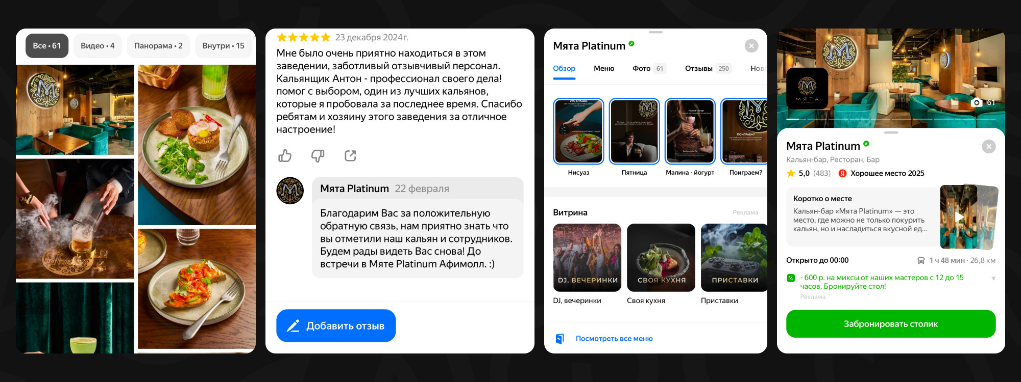 У каждого из нас есть карты в телефоне — как удобнее доехать до нужной точки, выбрать, куда сходить вечером с друзьями, а также посмотреть заранее время работы и меню заведения. Все это отличный шанс подсветить свое заведение и выделиться на фоне конкурентов. Опыт Мятных заведений показывает, что карты приносят в среднем 40% выручки в заведение. Поэтому настоятельно рекомендуем: