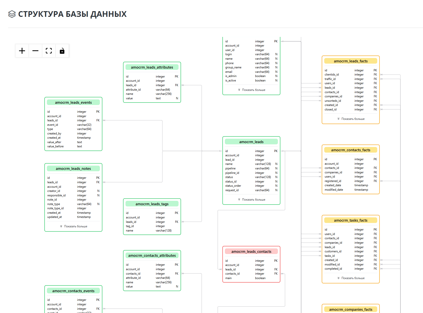 Схемы выгрузок для наших источников бывают достаточно крупными, вот к примеру часть структуры базовой выгрузки данных из API amoCRM: Всего в ней 50 таблиц, она подробно описана в документации mybi conenct. Но и подробное описание с картинкой не позволяет быстро приступить к работе. Именно поэтому новый функционал EDR-схем позволяет перетаскивать таблицы и формировать нужную понятную структуру из используемых таблиц, например, перестроить схему в горизонтальный вид. Это только первый шаг, который мы реализовали и анонсировали в этом направлении, функционал будет развиваться, поэтому если вам интересно — подписывайтесь на наши обновления.