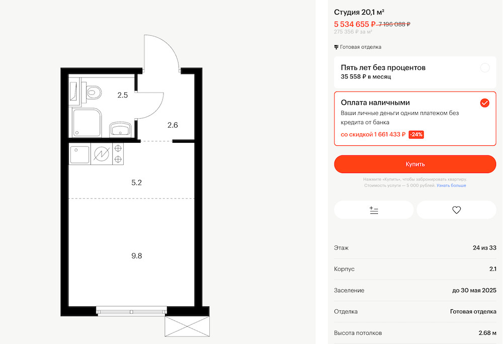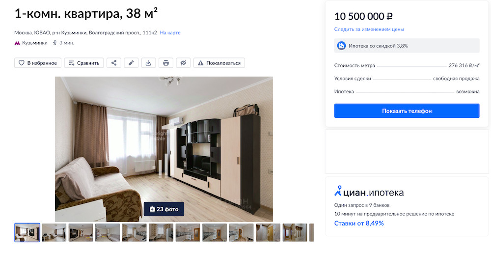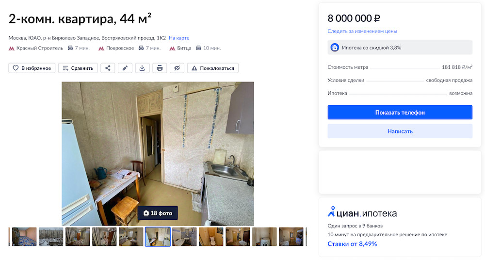Если хотите локацию поинтереснее или другого застройщика, готовьте 6,5-7 млн. В этом бюджете у того же ПИК есть неплохие варианты близко к центру, например, «Второй Нагатинский» или «Перовское 2». Если у других застройщиков — можно рассмотреть ЖК Parkside, «Level Южнопортовая» или «Дмитровское небо». Да, на «Циан» можно еще найти вторичные варианты студий за 2, 3 и 4 миллиона. Мы бы их покупать не стали. В основном это неликвид — апартаменты, крошечные площади, первые этажи и отсутствие ремонта. Толку от такой недвижимости немного, продать ее потом будет сложно. Однокомнатные квартиры стартуют от 7 миллионов. Это точечные варианты квартир площадью 30 кв. м в очень плохом состоянии в районах типа Бирюлево или Вешняков. За 7,5-8 млн выбор уже достаточно большой разной степени «убитости». Если вам подходят дома 60-80-х годов и вы планируете делать ремонт, можно отталкиваться от этой суммы. В новостройках за эти деньги тоже можно взять квартиру. За 7,5 млн есть маленькие евродвушки с отделкой у ПИКа — в ЖК «Люблинский парк» и «Алтуфьевское 53». Это проекты в плохих локациях, зато внутри МКАД — если бюджет минимальный, можно рассмотреть. Начиная с 8 млн уже появляются «убитые» двушки — аналоги однушек за 7 млн. Достаточно большая масса квартир, заметно подешевевших за последние месяцы, — каждая вторая продается со снижением январской или декабрьской цены. Однушки будут поновее и поприличнее. Двушки — только в старых домах или в ЖК «Люблинский парк» (там есть варианты от 9,6 млн). На первичном рынке за такую цену можно взять однушку в неплохом проекте поближе к центру. Или в бизнес-классе — ЖК Wave или «Селигер Сити». Если вы хотите комфортную однушку площадью 37-40 кв. м в доме не старше 1990 года и недалеко от метро, закладывайте сумму около 10,5 млн. На эти деньги можно купить либо готовый вариант с нормальным ремонтом, либо квартиру подешевле и сделать косметику. В новостройках уже можно рассмотреть однушки со сдачей в 2023 году у застройщика или по переуступке: ЖК «Зеленая вертикаль», «Тринити», «Михалковский», Profit. Двушки за эту цену будут только у ПИКа. При выборе что у застройщика, что на вторичке, не забывайте торговаться — спрос низкий, и выбить хорошую скидку сейчас вполне реально. Подписывайтесь на наши разборы рынка недвижимости в Telegram.
