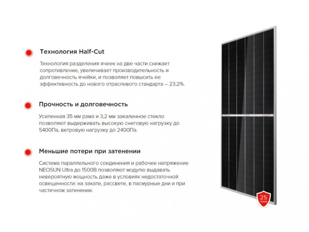 Компания Neosun Energy начала производить солнечные батареи с использованием технологии Half-Cut PERC и 9ВВ ячеек. В отличие от предыдущего поколения модулей, где использовалась только PERC технология, ячейки в новых модулях дополнительно разрезаны пополам, а количество токопроводящих шин выросло с 5 до 9 штук.
