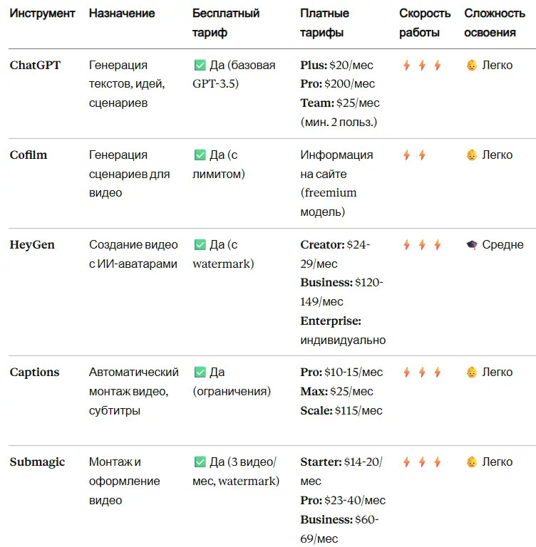 Сравнительная таблица цен ИИ-инструментов для автоматизации контента
