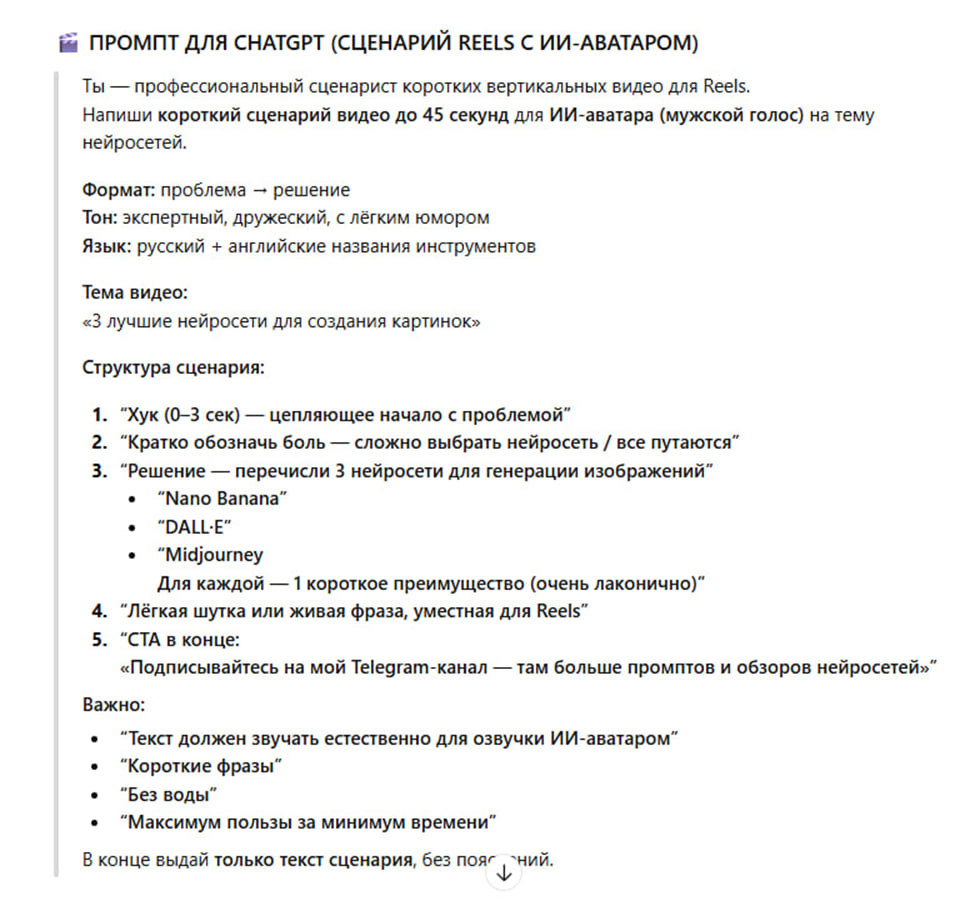 Но тут возникает вопрос: «А какой промпт использовать?». Можно и тут использовать ChatGPT, просто просим его написать промпт для промпта Далее вставляем результат в тот же чат и на выходе получаем готовый сценарий для видео Отлично, теперь когда у нас есть сценарий мы идем превращать его в видео Видео всегда усиливает охваты, но требует вреся и сил. HeyGen идеально подойдет для решения этой задачи. Вставляем ему наш промпт и получаем на выходе готовое видео ИИ здесь — не замена личности или творчества, а способ масштабироваться без дорогих студий и съемок. Итоговое видео получилось вот таким: Кстати, если вам не нравиться ИИ-аватары, вы можете создавать видео в любой другой генеративной ИИ. Мы разобрали подробно 3 популярных в нашей статье Любое видео или текст нуждается в качественной упаковке. Для этого можно использовать Captions и Submagic. Я использую первый Хорошие субтитры и оформление часто может улучшить восприятие видео и поднять охватов. Так как HeyGen уже добавил нам монтаж мы просто добавляем интересные субтитры Эти инструменты используют AI для автоматического оформления, что экономит время авторам, рерайтерам и специалистам по SMM. Это особенно полезно при массовом создании постов и видео. Эти инструменты используют ИИ для автоматизации оформления. Это сильно экономит время и убирает рутину из интересного процесса. Особенно поможет при массовом создании контента Итоговая версия видео: в нашем телеграм-канале В результате вы получаете не просто помощь, а чуть ли не полноценную студию. Тексты статьи, посты и видео. Всё это есть возможность выкладывать регулярно и без стресса Что по времени? На создание сценария было потрачено 4 минуты в ChatGPT, генерация видео в HeyGen — 5 минут, и ещё столько же в captions. Итого было потрачено 14 минут на создание видео Первая ошибка: полностью полагаться на нейросети. Без проверки. Без анализа. Детектор ИИ-контента, теневой бан, потеря аутентичности — всё это реальные риски. Не забывайте добавлять свою изюминку и немного изменять контент Вторая ошибка: использовать ИИ без четкого ТЗ. Без контекста нейросеть выдаёт усредненный текст. Если не получается придумать промпт самим, просто попросите ИИ сделать это за вас, как в первом этапе Третья ошибка: отсутствие факт-чекинга. Особенно важно проверять конечный материал в экспертных и юридических темах. Чек-лист для старта Определите цель блога или статьи. Выберите 1–2 инструмента. Используйте ИИ для черновиков, а не финальной версии. Оцените результат и масштабируйте процесс. ИИ — это инструмент для авторов, блогеров, предпринимателей и специалистов. Он ускоряет создание контента, помогает с улучшением текста и масштабированием. Формула проста: AI + человек = рост. Нейросети берут рутину, авторы — смыслы. Именно так контент работает на результат, а не на выгорание. ИИ — это инструмент для авторов, но не замена. Он ускоряет создание контента, помогает с масштабированием, но в конечном итоге именно человеческая рука скажет «добро» Формула проста: ИИ + человек = рост. Нейросети забирают рутину, а авторы — смысл. Именно такая схема принесет плоды, а не выгорания В следующей статье мы рассмотрим как подключить генерацию видео к чат-боту и автоматизировать заявки А пока прочитайте другую статью на моём блоге в VC. Как научить ИИ говорить по делу: короткие рабочие приёмы