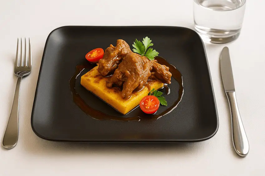 - Жареная полента с копченым маслом и вялеными томатами как база для тушеного кролика
