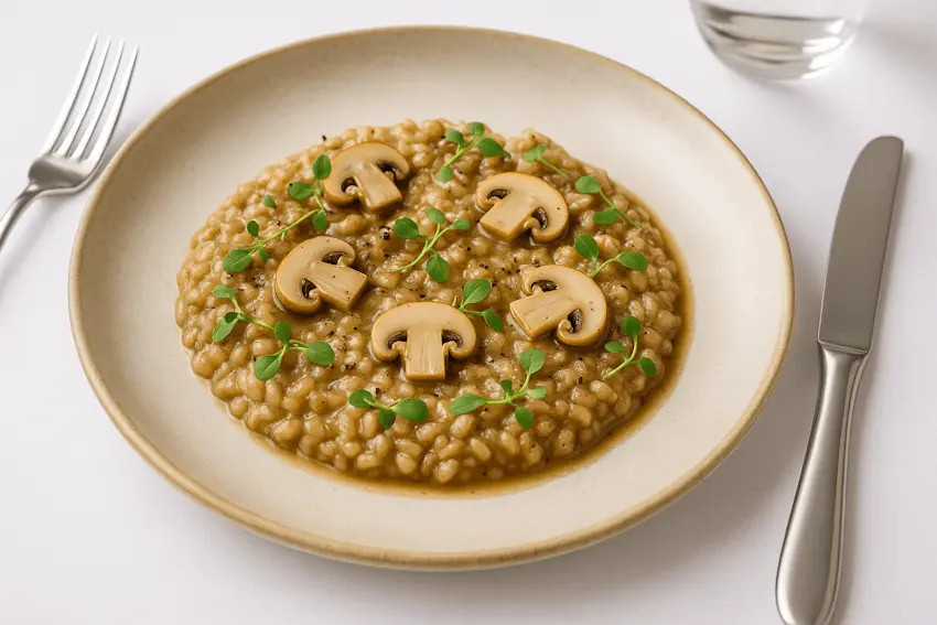 - Ризотто с грибным соусом, маринованными шампиньонами и микрозеленью