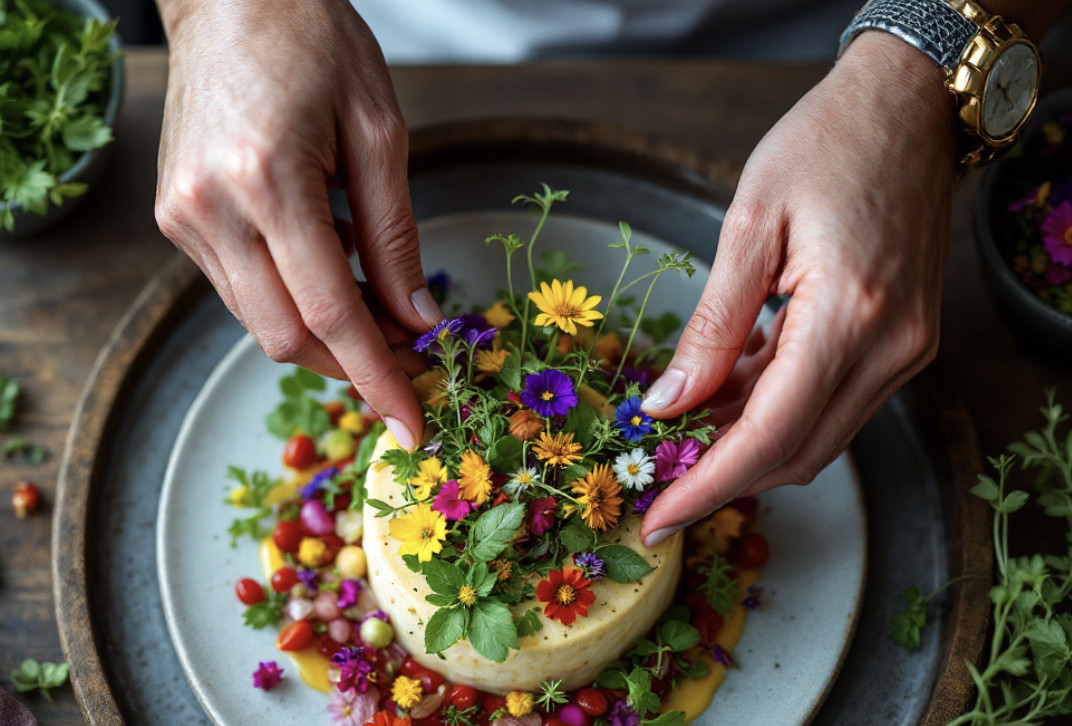 Минимализм остается главным трендом — лаконичная подача с акцентом на качество продуктов. Популярны натуральные элементы декора: микрозелень, съедобные цветы, ягоды. Асимметрия в выкладке создает динамику и современный вид.