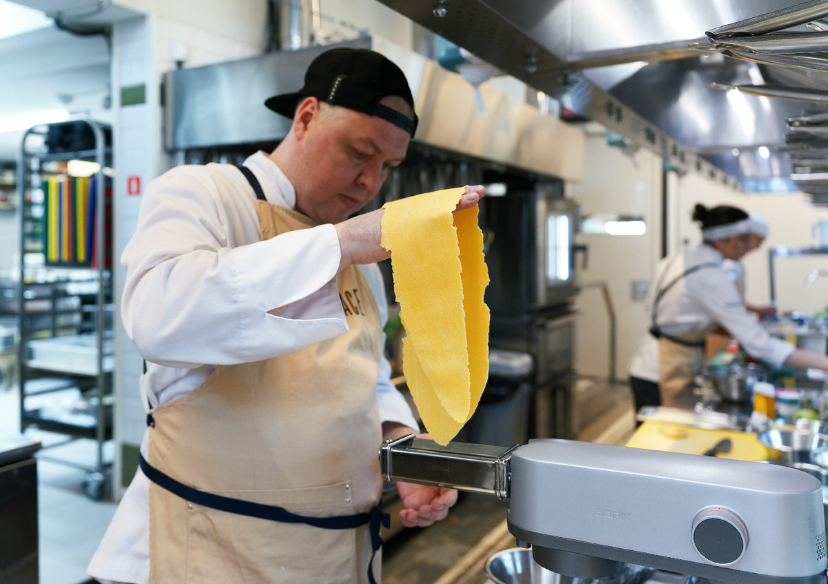 Яйца в карбонаре нельзя нагревать выше 65–70 градусов. Но термометр никто не держит. Шеф чувствует это по тому, как меняется консистенция смеси, как она начинает тянуться, как отражает свет. Этому невозможно научиться по описанию. Только стоя у плиты.