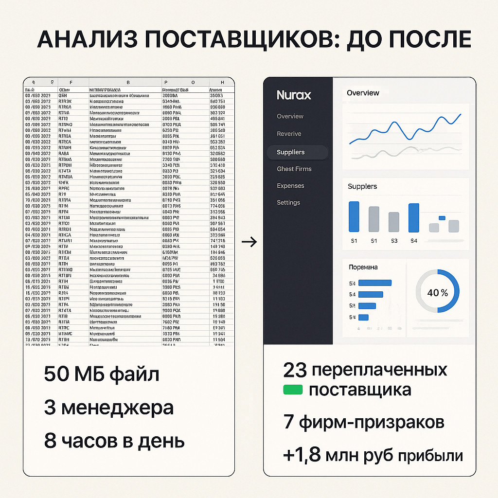 Платформа Nurax показала впечатляющие результаты в четырех компаниях разных отраслей. Компания «ТехноПлюс» смогла кардинально изменить свою финансовую ситуацию: с ежемесячного убытка в 1.2 млн рублей они перешли к стабильной прибыли в 1.8 млн рублей ежемесячно. Общая экономия составила 3 млн рублей в месяц.