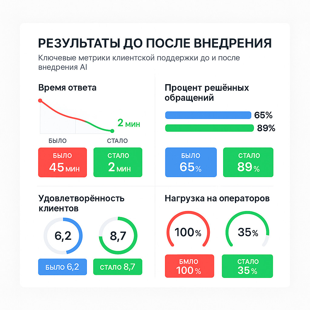 Результаты тестирования: 76% успешность автоматического решения. Время ответа системы всего 1.2 секунды при 94% точности распознавания намерений!