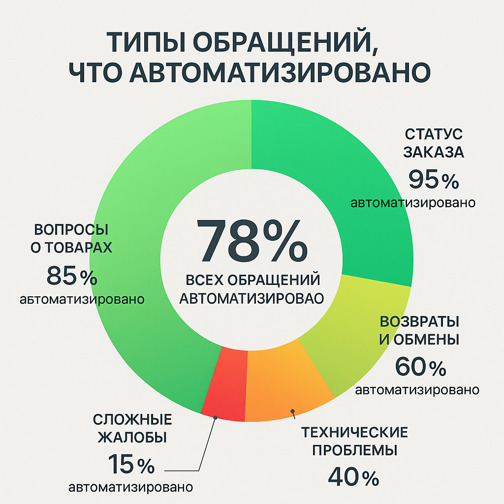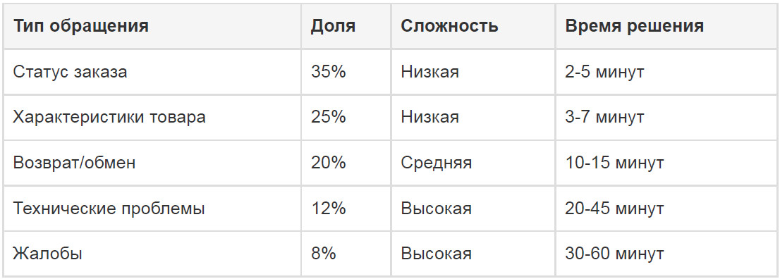 - 60% обращений — рутинные запросы, не требующие экспертизы.