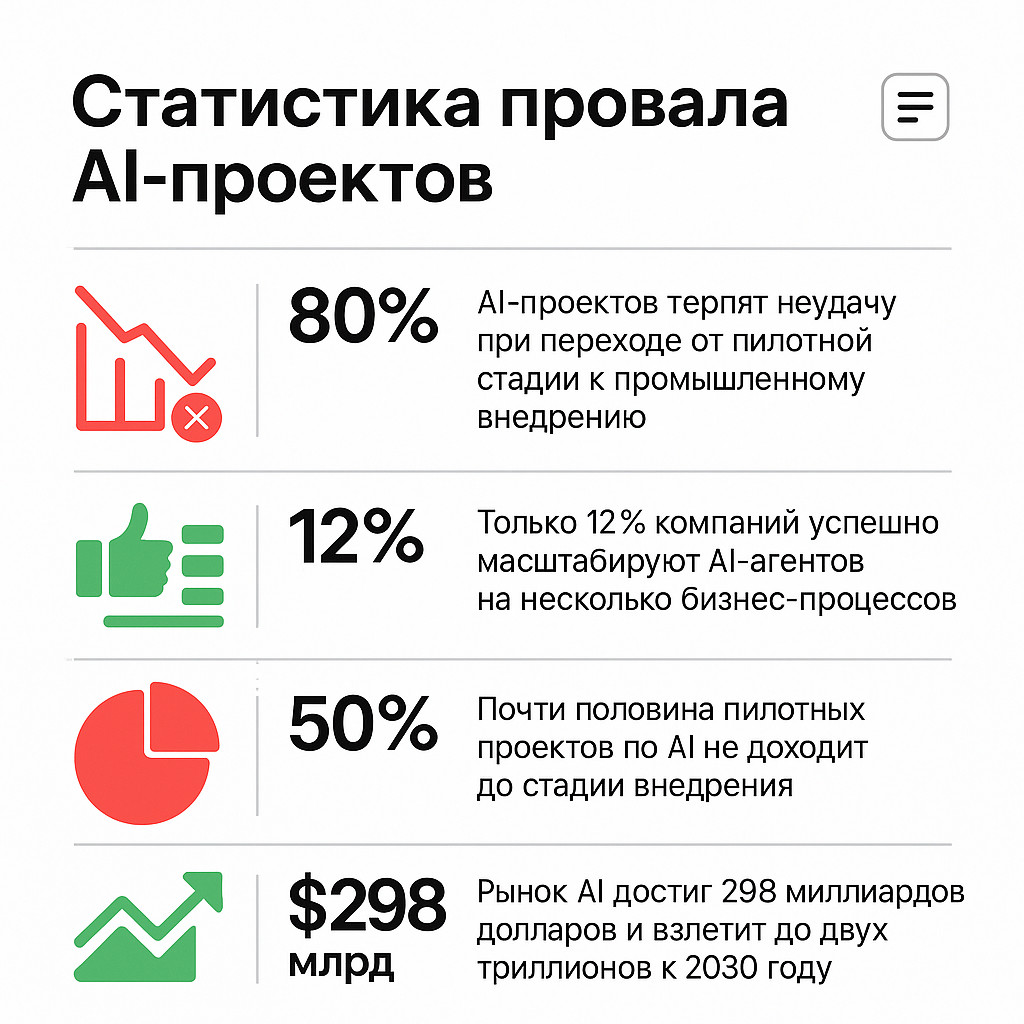 Однако за впечатляющими цифрами роста скрывается тревожная статистика: более 80% AI-проектов терпят неудачу при переходе от пилотной стадии к промышленному внедрению. Только 12% компаний успешно масштабируют AI-агентов на несколько бизнес-процессов.