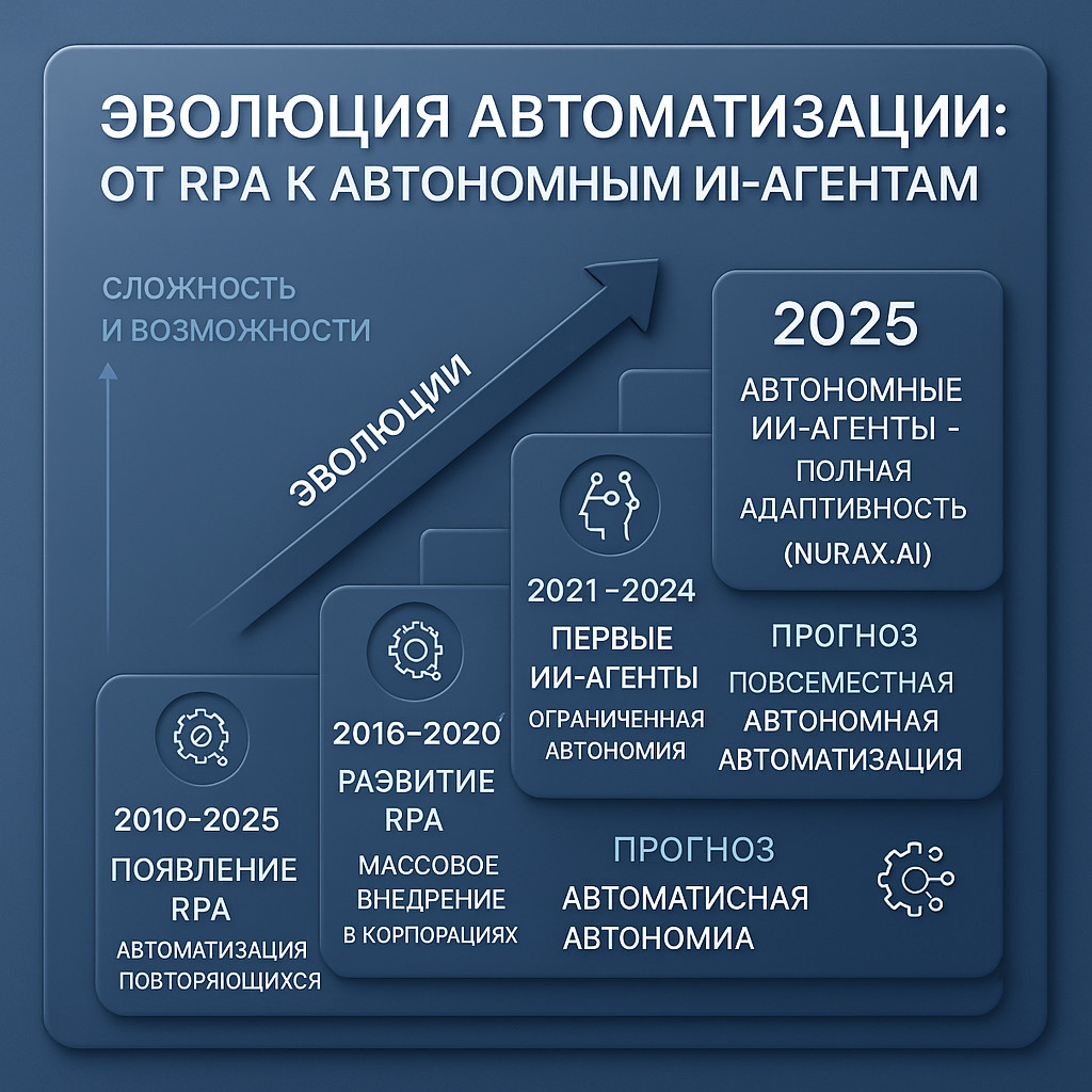 RPA-подход основан на жестких сценариях, которые не могут изменяться в процессе выполнения. Автономные ИИ-агенты, напротив, демонстрируют высокую адаптивность. Например, платформа Nurax.ai может автоматически обрабатывать исключения в бизнес-процессах, адаптируясь к изменяющимся условиям без вмешательства разработчиков. RPA-внедрение требует детального программирования каждого шага процесса. ИИ-агенты используют принципиально иной подход — обучение на данных. Веб-интерфейс Nurax.ai позволяет настраивать агенты через простое описание задач на естественном языке. RPA-системы демонстрируют линейный рост сложности при масштабировании. Автономные агенты обеспечивают экспоненциальное улучшение эффективности. Автомасштабирование Nurax.ai позволяет системе самостоятельно распределять нагрузку и оптимизировать производительность. RPA-технологии эффективны только при работе со структурированными данными в предсказуемых форматах. ИИ-агенты способны обрабатывать данные любых форматов: неструктурированные тексты, изображения и документы, аудио и видео контент. Детальное сравнение технических характеристик показывает принципиальные различия в архитектуре, методах интеграции, производительности и требованиях к поддержке между RPA и ИИ-агентами. При выборе между RPA и ИИ-агентами следует учитывать: Наиболее эффективной стратегией для многих организаций становится гибридный подход, сочетающий преимущества обеих технологий. RPA-системы обрабатывают стандартные, предсказуемые задачи, а ИИ-агенты берут на себя сложные случаи, требующие анализа и принятия решений. Оптимизация затрат — каждая технология используется в своей области максимальной эффективности. Повышение надежности — RPA обеспечивает стабильность для рутинных операций, ИИ-агенты — гибкость для сложных случаев. Плавная миграция — организации могут постепенно переходить от RPA к ИИ-агентам. Платформа Nurax.ai демонстрирует успешную интеграцию с существующими RPA-системами, позволяя организациям эволюционно развивать свою автоматизацию без кардинальной перестройки инфраструктуры. Мультимодальные агенты — к 2027 году 40% решений на основе генеративного ИИ станут способными обрабатывать текст, изображения, аудио и видео в рамках единой системы. Агентная автоматизация — переход от отдельных ботов к экосистемам взаимодействующих агентов, каждый из которых специализируется на определенных задачах. Низкокодовые платформы — упрощение создания и настройки автоматизации для бизнес-пользователей без технического образования. Согласно исследованиям ведущих аналитических агентств: Полная замена не всегда целесообразна. Если RPA-система стабильно работает и покрывает бизнес-потребности, лучше дополнить ее ИИ-агентами для обработки сложных случаев. Ключевые компетенции включают понимание принципов машинного обучения, навыки работы с данными, знание предметной области и базовые навыки программирования. Типичные показатели ROI: первый год 200-300%, второй год 400-600%, долгосрочная перспектива 800-1200%. Основные источники экономии: сокращение времени обработки задач на 60-80%, снижение количества ошибок на 90%. Сравнение автономных ИИ-агентов и традиционной RPA-автоматизации показывает, что мы находимся на пороге новой эры корпоративной автоматизации. Хотя RPA-технологии продолжают играть важ