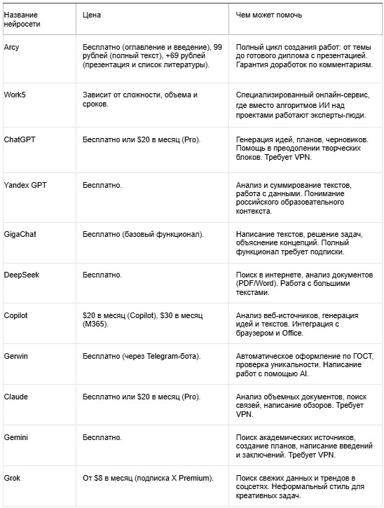 Выбор зависит от специфики вашего проекта и доступного бюджета. Arcy остается лучшим выбором для большинства студентов благодаря специализации на учебных задачах и цене в 169 рублей.