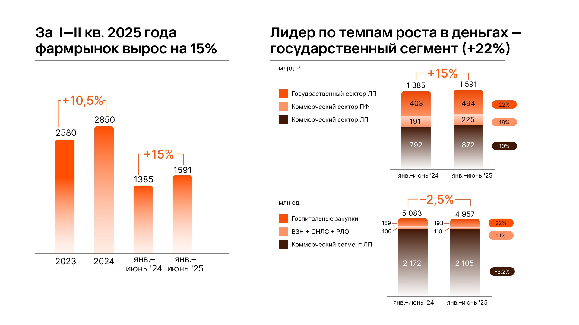 Государственные закупки лекарственных препаратов (ЛП) показали прирост на 22,6%, до 494 млрд рублей, что стало главным драйвером динамики объема рынка.