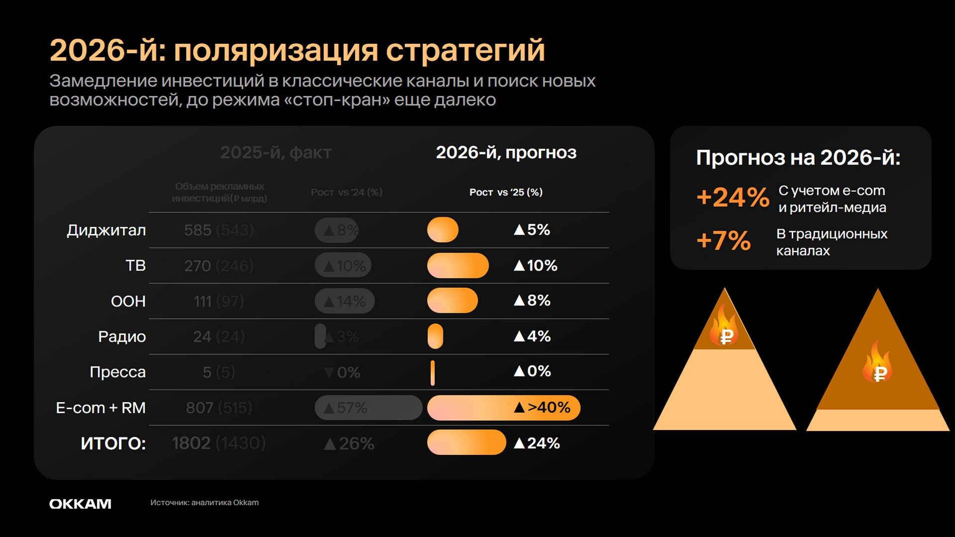 Прогноз Okkam от сентября прошлого года предполагал, что рекламный рынок в целом вырастет сильнее, на 35%. Замедление диджитала повлияло сильнее, чем виделось осенью, объясняет Дарья Куркина: инвестиции в диджитал показали рост только на 8%, до 585 млрд рублей.