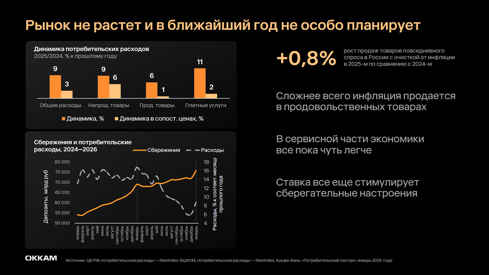 В то же время почти все крупные рекламодатели, по данным группы, в 2025-м увеличили рекламные бюджеты, подчеркнула она. Самый крупный сегмент, e-com и ритейл-медиа, показал рост на 57%, до 807 млрд рублей. Объем инвестиций в ТВ-рекламу составил 270 млрд рублей (+10%), OOH — 111 млрд рублей (+14%), рекламу на радио — 24 млрд рублей (+3%), в прессу — 5 млрд рублей (не изменился). Дарья Куркина также представила обновленный прогноз Okkam на 2026 год. Группа ожидает, что в текущем году рост рынка в целом замедлится до 24% с учетом рекламы в e-com и ритейл-медиа и до 7% в традиционных каналах. В совокупности расходы брендов на продвижение преодолеют отметку в 2 трлн рублей. Предыдущий, осенний прогноз Okkam, был немного оптимистичнее: ожидался рост рынка в целом на 28% и рост в традиционных каналах на 12%. Главной причиной корректировки стал диджитал: по нему изменения самые заметные. Так, если осенью 2025 года аналитики Okkam прогнозировали рост диджитал-рекламы на 10–15%, то сейчас ожидаемая динамика по этому сегменту составляет только 5%. Рост e-com и ритейл-медиа-сегмента все так же ожидается самым динамичным — свыше 40%. Прогнозы Okkam по ТВ-рекламе остались прежними — рост на 10%. Прогнозы по наружной рекламе и рекламе на радио уточнены: в OOH ожидается рост на 8% (в сентябре аналитики говорили о 7–10%), по радио — рост на 4% (в сентябре прогнозировали 3–5%). Роста в прессе, как и ранее, не ожидается. В 2026 году рынок ждет замедление инвестиций в классические каналы и поиск новых возможностей, потому что рынок в гражданской части экономики «не растет и в ближайший год не особо планирует», по словам Дарьи Куркиной. Если анализировать потребление без учета инфляции (сравнивать продажи товаров в сопоставимых ценах), то видно, что потребители не наращивают расходы, и особенно сильно это сказывается на сегменте продовольственных товаров. Так, рост продаж товаров повседневного спроса в России с очисткой от инфляции в 2025-м по сравнению с 2024-м составил только 0,8%. В сервисной части экономики рост пока сохраняется (11,3%), однако его природа преимущественно инфляционная. Медленное снижение ключевой ставки ЦБ РФ все еще стимулирует россиян больше сберегать, и момент возвращения средств с депозитов в товарное потребление пока откладывается. Несмотря на стремление экономить, люди чаще ищут более качественные продукты и готовы тратиться на удовольствия. Согласно данным исследования потребительского поведения компании Б1, качество продукта или услуги становится все более важным критерием покупки (осенью 2025 года его отмечают 83% против 58% осенью 2022-го). Импульсивные покупки сохраняются: по данным ВЦИОМ, 63% россиян имеют опыт таких покупок в 2025 году против 57% в 2021-м. За год, по данным сервиса «Долями», в шесть раз выросла доля тех, кто тратит на маленькие радости до 2 тысяч рублей за раз. При этом потребитель перегружен сообщениями о скидках: по данным Nielsen, 40% потребителей считают, что в магазинах слишком много информации об акциях и скидках (рост на 4% по сравнению с прошлым годом), и 22% редко замечают скидки и специальные предложения (+5% к 2024-му). В Okkam это связывают с резким ростом доли промо в коммуникациях: по оценке группы, она увеличилась с 23% до 40% за последние пять лет. ТВ останется самым быстрым способом построить охват в 2026 году, при этом, как подчеркивают в Okkam, в сегменте постепенно меняется способ потребления: техни