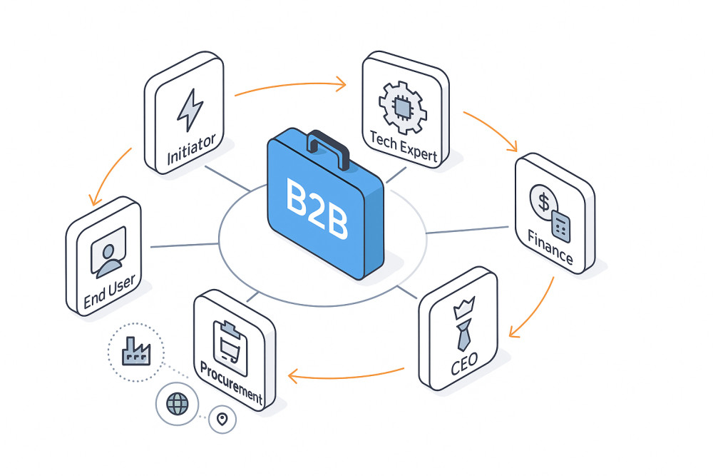 В B2B решение принимает группа — инициатор запроса, будущий пользователь, технический эксперт, финансист и руководитель. Чтобы сообщения были релевантными и воронка продаж двигалась предсказуемо, важно чётко определить роли, контекст и критерии выбора.