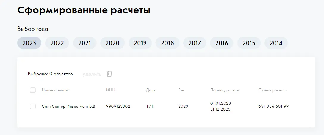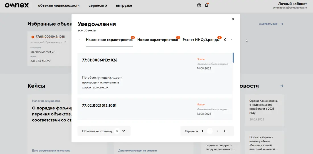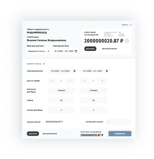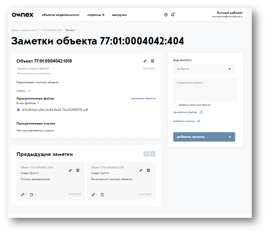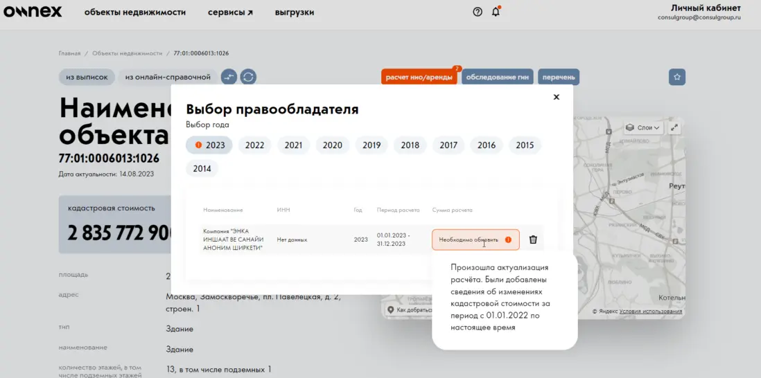 В личном кабинете пользователь (назовем его «главный пользователь») может приглашать в систему коллег/сотрудников, с возможностью присвоить различные права доступа. Например, у собственника нескольких объектов недвижимости есть штатный бухгалтер и юрист. Как правило, за расчет налоговых обязательств отвечает бухгалтер, соответственно, собственник объекта может запретить юристу редактировать произведенный бухгалтером расчет суммы налога на имущество. Кроме того, можно скрывать из видимости некоторые объекты определенному пользователю. Приглашение в систему. Главный пользователь обладает правами на приглашение в систему любых пользователей в пределах лимита. Как правило, генеральные директора (или собственники) приглашают в систему всех юристов и бухгалтеров в компании. В некоторых случаях и других сотрудников. Для приглашения достаточного всего-лишь указать почту пользователя, которому необходимо дать доступ в систему. Такому пользователю на почту придет письмо-приглашение. После его принятия у данного пользователя откроется доступ в систему с указанными для него правами. Главный пользователь в любой момент может как добавить, так и удалить пользователя. В разделе «Объекты недвижимости» отображаются все объекты пользователя. Список представлен в табличном виде. Присутствует возможность фильтрации объектов по типу, площади, стоимости и т.д. Также присутствует возможность группировки объектов по любым параметрам, например, по юрлицу или территориальнму признаку. Ниже таблицы отображается карта, на которой указано местонахождение объекта. Чтобы получить подробную информацию о каждом объекте, нужно перейти в его паспорт. Это можно сделать, нажав на кадастровый номер объекта или воспользовавшись картой, на которой указано местоположение недвижимости. При нажатии на конкретный объект недвижимости пользователь попадает в паспорт объекта, который представляет из себя набор сведений об объекте: Паспорт объекта содержит все данные об объекте, которые содержатся в ЕГРН. В случае изменений какой-либо характеристики, в паспорте объекта остается История изменений, с помощью которой можно посмотреть когда и какие сведения менялись. Также, в паспорте объекта содержатся сведения о связанных объектах (например, земельный участок, на котором стоит здание). В каждом паспорте объекта присутствует раздел с Заметками, куда можно подгружать техническую информацию по объекту (например, кадастровый паспорт), а также делать важные записи касающиеся данного объекта. Пожалуй это один из основных разделов платформы OWNEX для бухгалтеров и финансистов. В каждом паспорте объекта присутствует окно «Расчет НИО/аренды» с помощью которого пользователь может рассчитать сумму налога на имущество или арендной платы за участок и сохранить. Система сама подскажет какую базу необходимо использовать для расчета налога на имущество — кадастровую или среднегодовую стоимость, а также укажет действующую ставку налога на имущество в субъекте, в котором находится объект. Все сохраненные расчеты отражаются в паспорте объекта. Можно переключаться между годами и смотреть ранее сохраненные расчеты. Любое изменение в характеристиках объектов, в расчетах сумм налога или арендных платежах не остается незамеченным! В каждом случае изменения хар