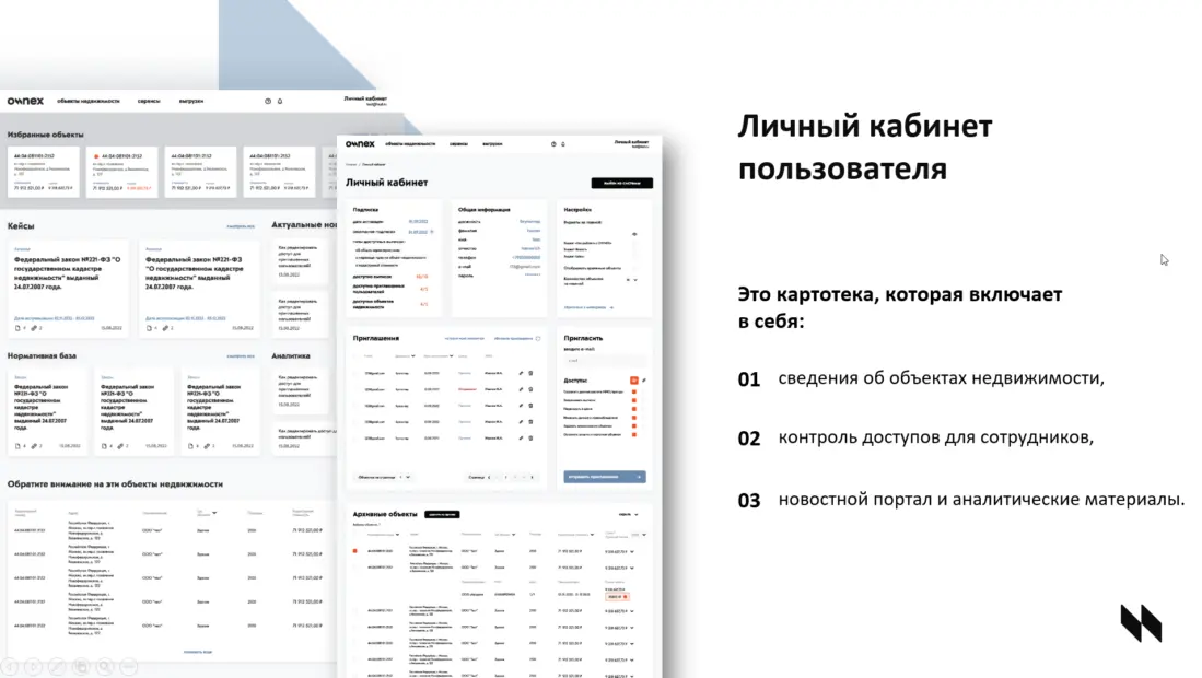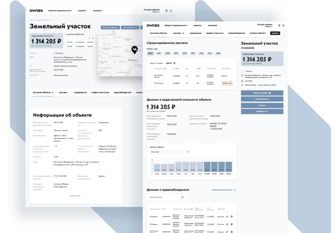 Ownex — это первая в России платформа, в рамках которой собственники коммерческой недвижимости могут мониторить изменения сведений в ЕГРН, следить за кадастровой стоимостью, изменениях в расчетах сумм налоговых и арендных платежей, централизованно хранить техническую документацию по объектам недвижимости, а также быть в курсе последних изменений в законодательстве, связанным с недвижимостью.