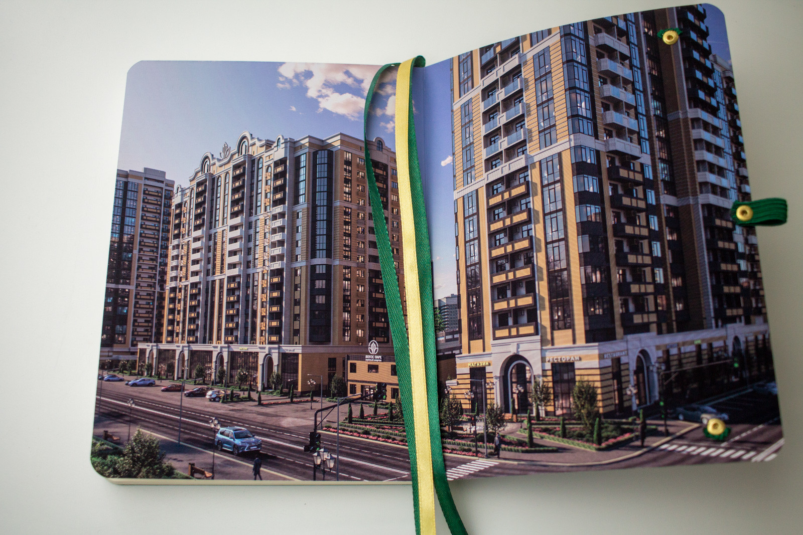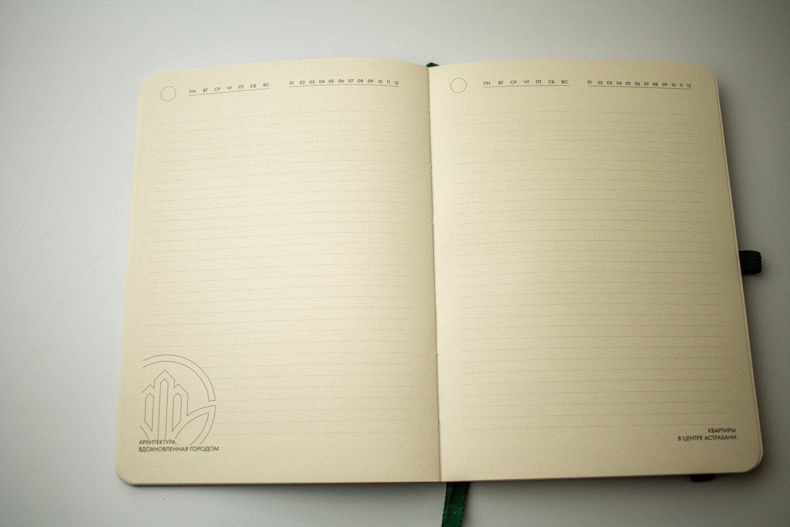 Мы использовали плотную бумагу цвета слоновой кости — на ней приятно писать и обычной ручкой, и маркером. Каждая страница несёт послание: на одной появляется фраза «Архитектура вдохновленная городом», на другой — «Квартиры в центре Астрахани». Эти короткие вставки работают как тихий мотив — они создают чувство сопричастности, не перегружая.