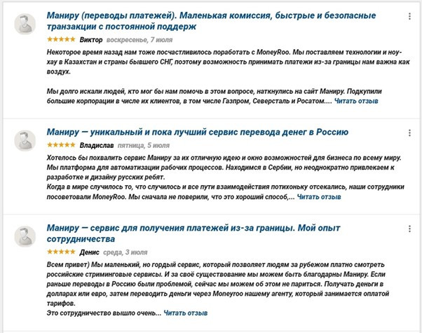 Cервис создан предпринимателями для предпринимателей. Сайт открылся весной 2024 года. С MoneyRoo сотрудничают: Аэрофлот, Росатом, Газпром, Aurus, Rapart, Северсталь, Евраз. Банками-партнерами являются Газпромбанк и Совкомбанк. Офисы MoneyRoo есть в США, Китае, Гонконге, ОАЭ, Испании, Турции, Индонезии, Латвии. Российские компании, работающие через МаниРу Стоит отметить, что MoneyRoo не является юридическим лицом. Это название сервиса. Названия реальных компаний не разглашаются, дабы они не попали под международные санкции. МаниРу — уникальный проект. В Рунете это первый случай, когда платежный сервис не был создан специально, а появился как побочный продукт реального бизнеса. MoneyRoo превосходит всех конкурентов по качеству услуг. Какие преимущества сервиса можно отметить: Если необходим быстрый перевод денег за рубеж, прямо сейчас обратитесь к специалистам сервиса через мессенджер Telegram @noawillson. Сайт MoneyRoo находится в доменной зоне .ru. Поскольку сервис действует абсолютно легально, ресурс не блокируется в России. На сайт можно зайти всегда. Чтобы получить консультацию, нужно зарезервировать ее время. Заявка подается через контактную форму либо в канале Telegram. На консультации нужно описать детали ситуации. Специалисты сделают анализ в течение нескольких часов. В этот же день получится перейти к оформлению перевода. Первая консультация бесплатная. После ее прохождения у клиента не возникает никаких обязательств. В любой момент можно отказаться от дальнейшего сотрудничества. Возможно живое общение со специалистами MoneyRoo. Офисы компании находятся в девяти странах. Список адресов выложен на сайте. Ту же информацию можно получить у менеджера в Telegram. На момент написания данного обзора проект существует два года. Несмотря на небольшой срок работы, MoneyRoo отзывы собирает исключительно положительные. Летом 2024 года в Рунете можно найти несколько десятков мнений пользователей относительно работы сервиса. Все комментарии выложены на независимых сайтах. В отзывах клиентов MoneyRoo отмечаются оперативность работы и низкая комиссия.