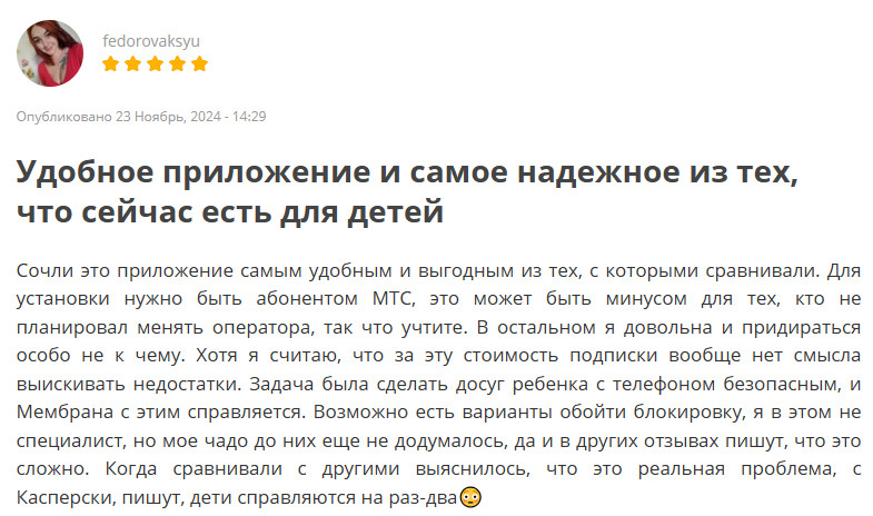 Родительский контроль — необходимая мера для защиты детей сегодня. Этого мнения придерживаются авторы отзывов о Membrana Kids от МТС. Что отмечают родители: