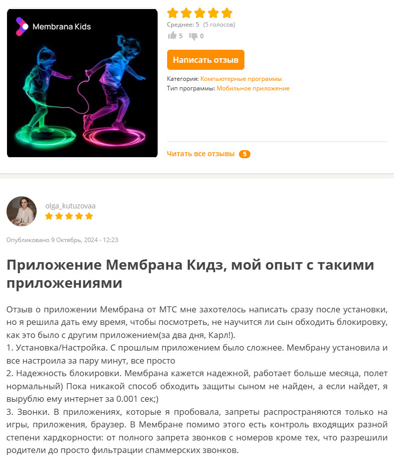 Отзывы о Membrana Kids от МТС говорят о том, что это приложение уже используют многие родители, заинтересованные в безопасности своих детей. Некоторые из них признаются, что подключили защиту уже после того, как ребенок попал в неприятность: отправил деньги мошенникам, перешел по фишинговой ссылке в мессенджере. Немало и тех, кто установил это приложение потому, что ребенок часами смотрит видео в TikTok вместо того, чтобы делать домашнее задание и заниматься чем-то конструктивным.
