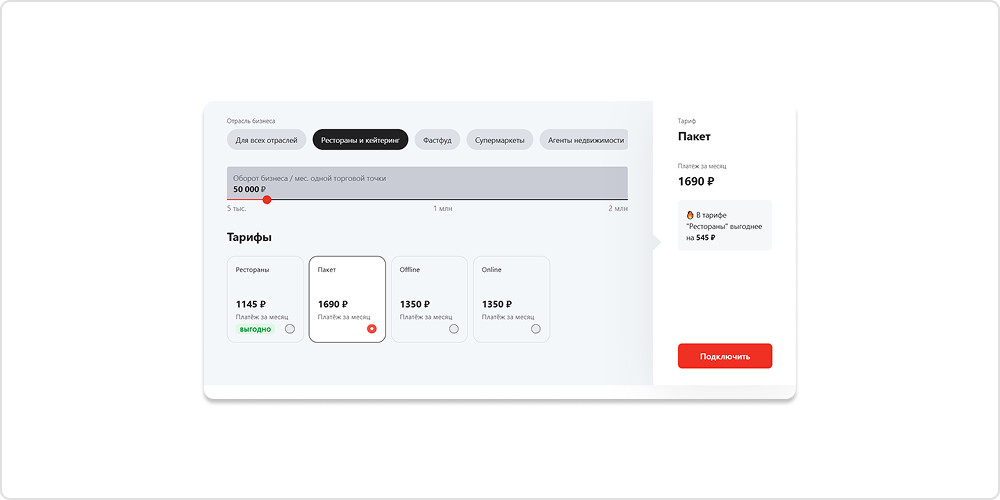 - Тарифы с фиксированной оплатой действуют для бизнесов с оборотом до 2 млн рублей, его стоимость начинается с 1690 рублей в месяц.