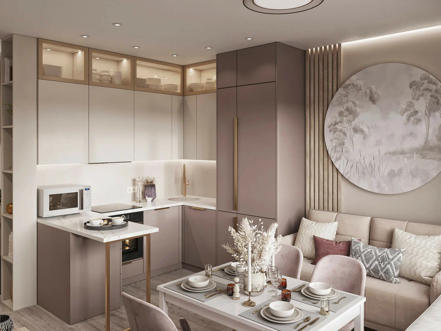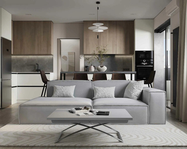 Не перегружайте пространство мебелью и декором. В комнате должно быть достаточно места для ходьбы. Дизайнеры советуют оставлять между крупными предметами минимум 60-70 см. Основными в оформлении интерьера кухни-гостиной в современном стиле становятся светлые спокойные тона. Для отделки стен и потолка подойдут бежевый, бледно-серый, а также подтона белого (молочный, сливочный, слоновой кости и другие). Их хорошо дополнить яркими акцентами терракотового, оливкового, каштанового, бирюзового, кораллового и других цветов. Для придания интерьеру живости допустимо использовать и темные тона. Например, добавьте в палитру глубокий синий, тёмно-зеленый или графитовый: эти цвета подойдут для фартука, дивана или фасадов мебели. Достаточно выбрать два-три цвета, которые хорошо сочетаются. Яркие тона лучше использовать в текстиле, декоре, мебели на фоне стен спокойного оттенка. Главный тренд в оформлении кухни-гостиной — это создание тактильного комфорта. Такой эффект дают натуральные материалы, например, дерево и камень в сочетании с фактурной штукатуркой. Вместо глянца выбирают матовые бархатистые поверхности, которые делают пространство теплее. Можно использовать качественную имитацию натуральных материалов. Например, в гостиной положите ламинат, который трудно отличить от дерева. Кухню можно отделать влагостойким керамогранитом «под камень». Но если вы хотите добиться подлинной тактильности, обязательно добавьте натуральные материалы. Живую теплоту дерева передают панели, покрытые шпоном, и инженерная доска. Приятной прохлады камня добавят украшения из тонких каменных слэбов на акцентных поверхностях. В моде плавные, мягкие формы мебели. Они напоминают природу: в лесу или на морском берегу почти нет острых углов и идеально прямых линий — только округлые камни, изгибы веток и волн. Когда мы используем такие же мягкие линии в интерьере, пространство подсознательно воспринимается как более естественное, спокойное и безопасное. Именно это чувство гармонии с природой и есть главная цель тренда на экологичность в дизайне. При этом эстетика в современных кухнях, совмещенных с гостиными, сочетается с функциональностью. Оставьте достаточно места для хранения и используйте вертикальное пространство: Максимально освободите столешницы: проанализируйте, какие предметы нужно оставить, остальное уберите в шкафы. Разместите предметы ближе к той области, для которой они предназначены. Например, ножи, растительное масло, кастрюли храните ближе к рабочей столешнице и плите. Бытовую химию расположите под мойкой. Также в тренде открытые полки. Чтобы они стали украшением, а не источником беспорядка, сперва решите, что именно вы хотите на них показать. Достаточно одной-двух: например, узкой полки для красивой посуды, которую вы используете каждый день, или ниши под бокалы. Так вы добавите интерьеру воздуха и индивидуальности, не усложняя уборку. Если хотите сделать кухню менее заметной, выбирайте встроенную бытовую технику и гарнитур с фасадами в цвет стен, без выступающих ручек. Так зона готовки «растворится» в пространстве и не будет бросаться в глаза. Уникальность кухне-гостиной легко добавить с помощью винтажной мебели и керамики ручной работы. Такие вещи подходят для стиля «тихая роскошь»: важно подобрать неброские, но безупречные п