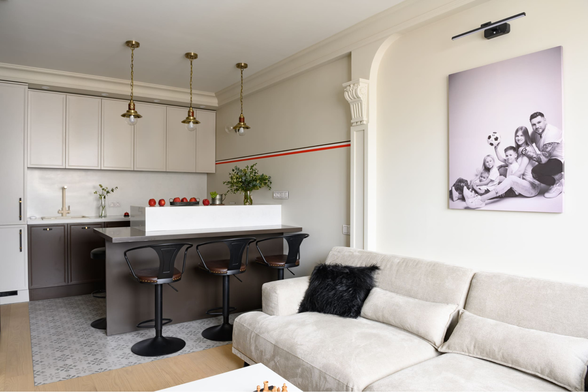 Вариант зонирования выбирайте исходя из размеров комнаты. Если у вас большая кухня-гостиная, смело ставьте барную стойку, остров или высокий стеллаж. А если комната маленькая, лучше разделить ее условно, например постелить на пол разные покрытия или поставить диван так, чтобы он отделял одну зону от другой.