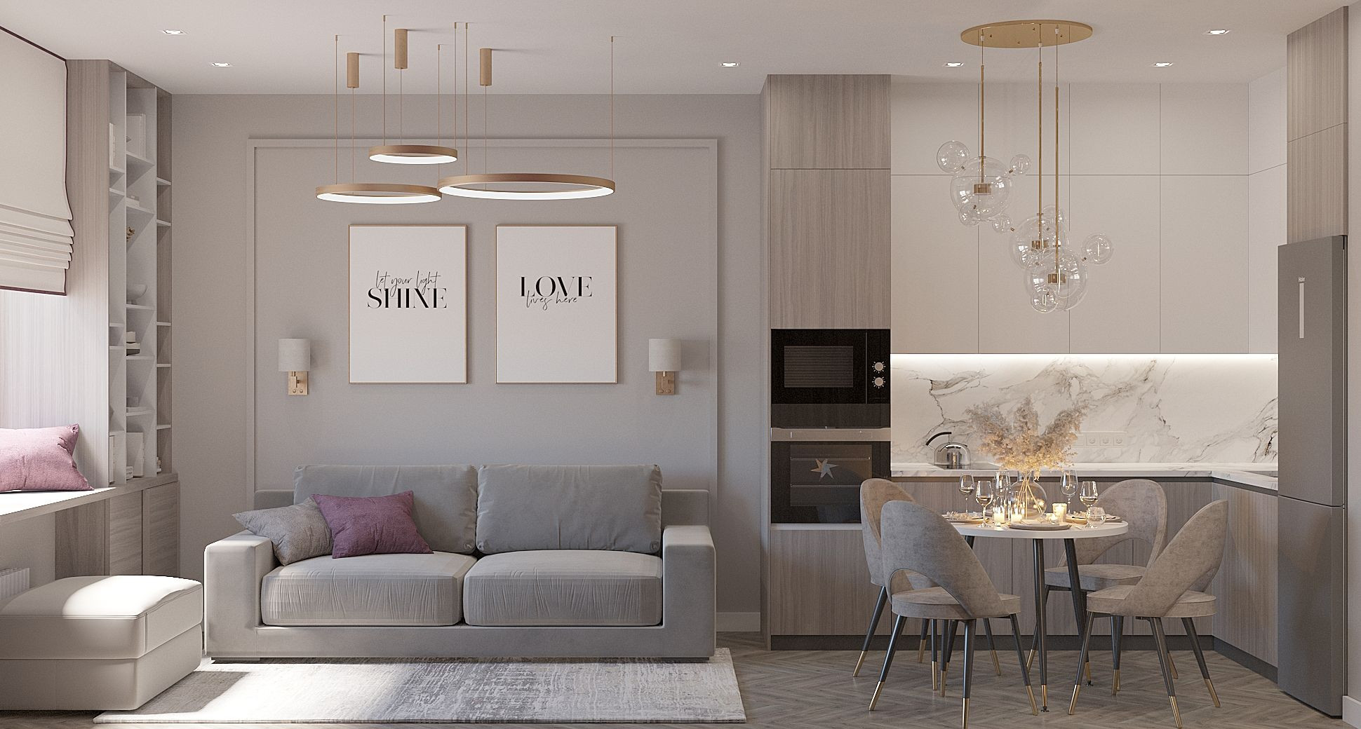 - если оконный проем один, оставьте его в гостиной, в зоне готовки смонтируйте хорошее искусственное освещение.