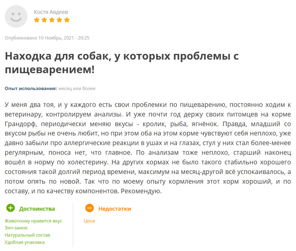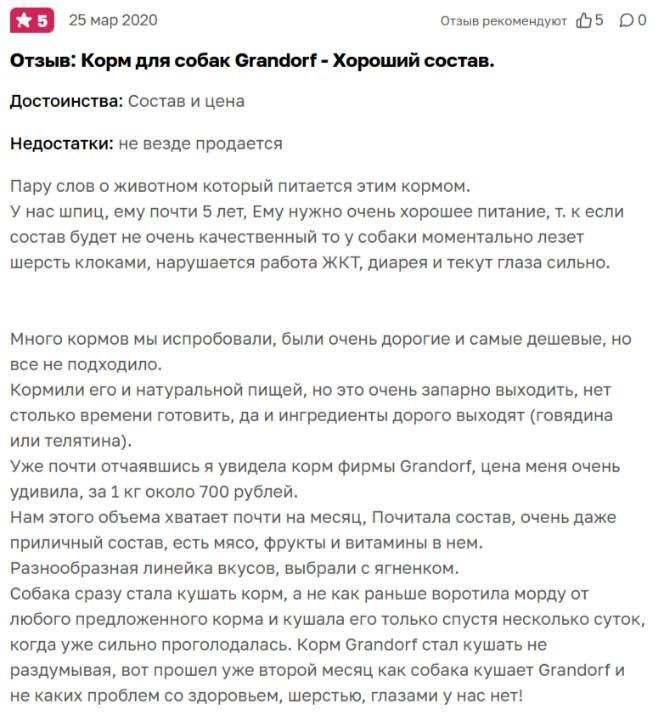 При анализе и сравнении отзывов о «Грандорф» можно заметить, что большинство покупателей отмечают улучшение качества шерсти у своих питомцев через несколько недель применения корма, а также стабильно оформленный стул.