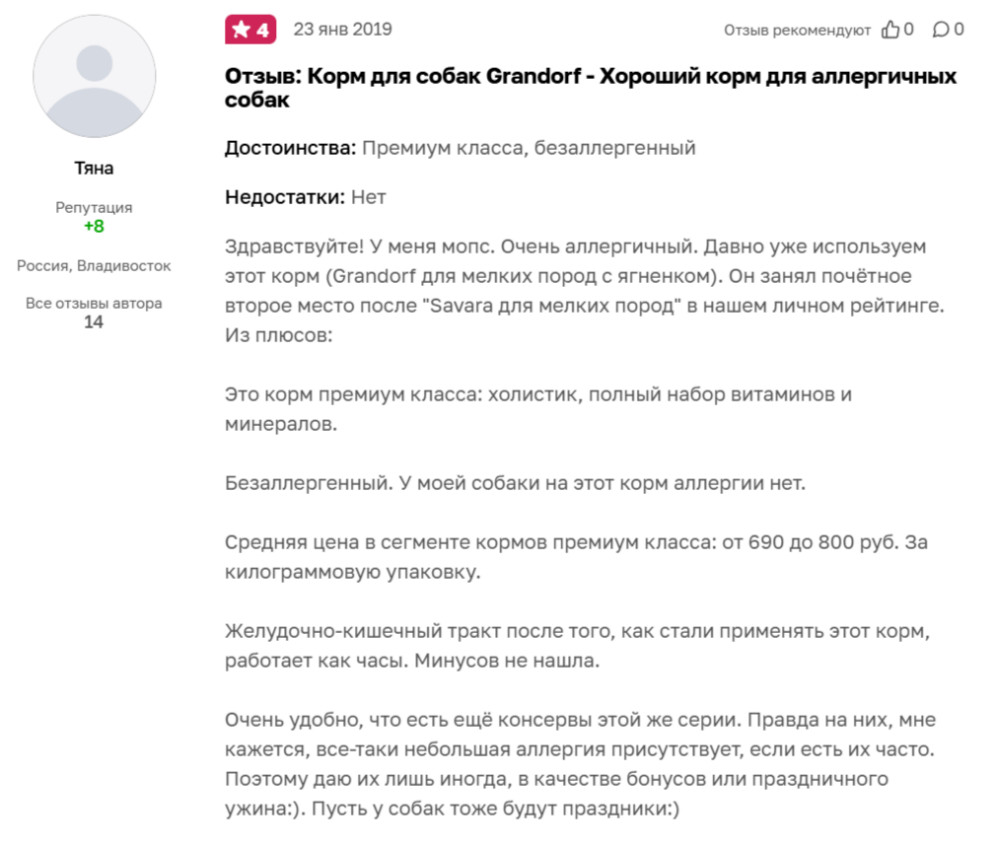 Изучая отзывы о корме для собак «Грандорф» на форумах любителей животных и сайтах-отзовиках, можно выделить несколько главных тем. Чаще всего люди пишут про состояние шерсти, «туалетные дела» и аппетит.