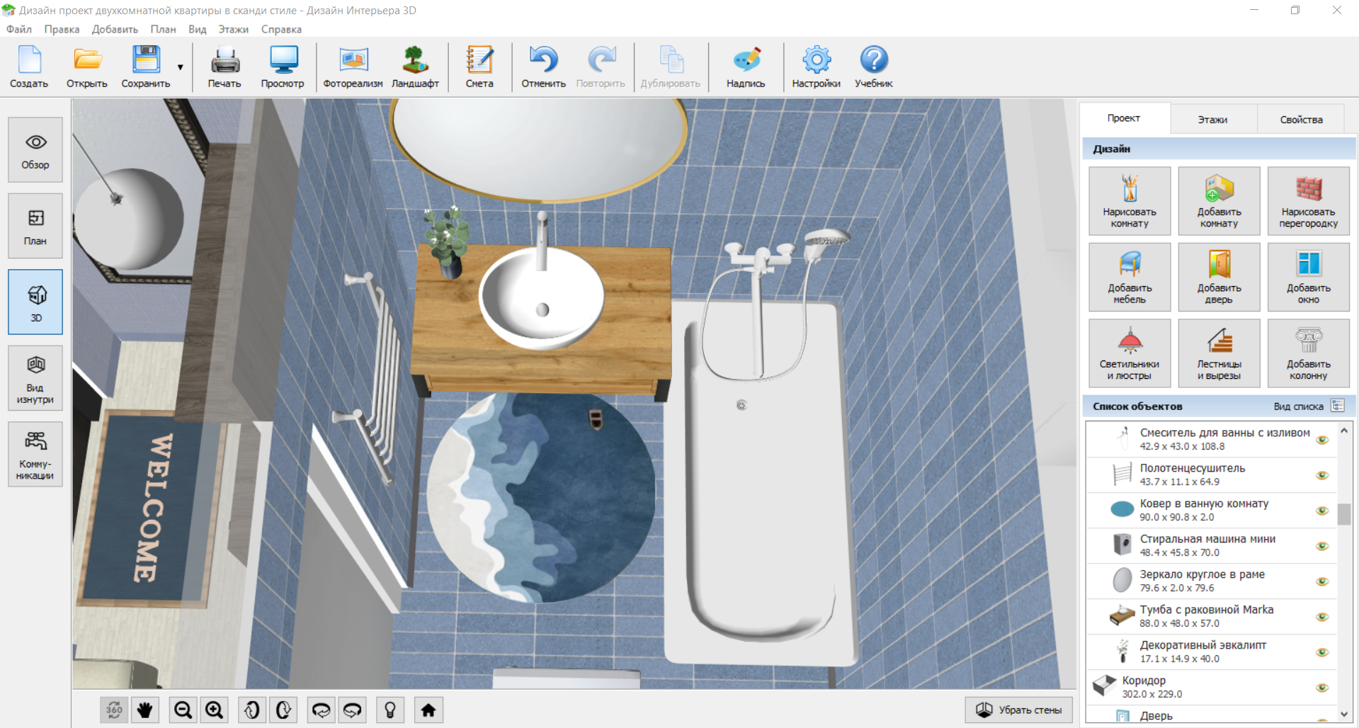 При ремонте в ванной комнате своими руками особенно важно правильно продумать планировку. На небольших площадях чаще всего используют линейное или угловое размещение, а также устанавливают душевую кабину, чтобы сэкономить место и сохранить удобное пространство для передвижения. В просторных санузлах появляется возможность разместить отдельную ванну большего размера, добавить биде, мебель для хранения или организовать комфортную зону для стирки и сушки белья. Планировку удобно создавать с помощью программ для дизайна ванной комнаты, которые позволяют визуализировать помещение. Если у вас нет опыта в проектировании и вы ищете простой, но функциональный сервис, обратите внимание на Дизайн Интерьера 3D. С помощью этой программы вы сможете протестировать разные варианты планировки и подобрать оптимальную. На комфорт в эксплуатации влияет расстояние между предметами. Перед раковиной и унитазом стоит оставлять свободное пространство примерно 70-80 см. Рекомендуется выдерживать не менее 50-60 см от края раковины до края унитаза или шкафа, чтобы избежать ощущения тесноты. При установке душевой или ванны оставляйте перед ними не менее 70–90 см свободного пространства для комфортного входа и выхода. Если вы планируете разобраться, как самостоятельно сделать ремонт в ванной, важной частью станет подбор материалов. На этом этапе нужно учесть, во-первых, финансовую часть вопроса, а во-вторых, уровень сложности монтажа. Необходимо продумать все так, чтобы не выйти за рамки бюджета, но при этом избежать лишних переделок и получить хороший результат. Если вы хотите скрыть коммуникации и установить точечное освещение, оптимальны натяжной или подвесной потолок. Натяжной представляет собой полотно на каркасе, которое полностью выравнивает поверхность, а подвесной позволяет монтировать панели или плитки. Если высота комнаты небольшая, удобнее использовать влагостойкую краску. Стоит учитывать, что предварительно потребуется выровнять поверхность, а со временем на местах стыков или слабых участках могут появляться трещины. При ограниченном бюджете хорошим решением для отделки потолка будут ПВХ-панели: они недорогие, легко монтируются и моются. Но не стоит слишком экономить: дешевые материалы часто теряют форму, из-за чего стыки становятся заметными. Керамическая плитка отлично подходит для помещений с высокой влажностью. Перед укладкой пол предстоит тщательно выровнять, прогрунтовать и очистить от пыли и грязи: это обеспечит надежное сцепление и снизит риск трещин или отклеивания. При ремонте ванной комнаты своими руками керамогранит часто выбирают для просторных санузлов, а также для мокрых зон, например, душевых без поддона, где вода напрямую стекает на пол. Он почти не впитывает влагу, устойчив к ударам и царапинам. В качестве более бюджетного напольного покрытия подойдут виниловые покрытия. Они водостойкие и простые в монтаже. Если вы решите поставить систему теплых полов, обратите внимание на максимальную допустимую температуру, указанную производителем. Если нужен практичный и проверенный вариант, чаще всего выбирают плитку. Она устойчива к воде, легко очищается, но требует подготовки стен и навыков в укладке плитки. Декоративная штукатурка подойдет в тех случаях, когда стены ванной имеют неровности или небольшие дефект