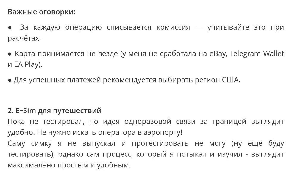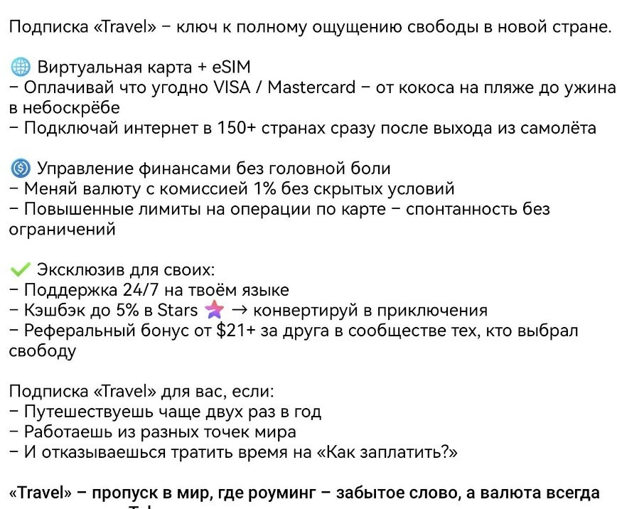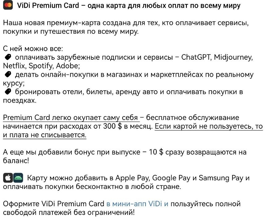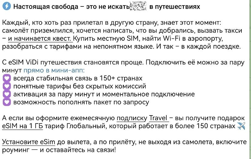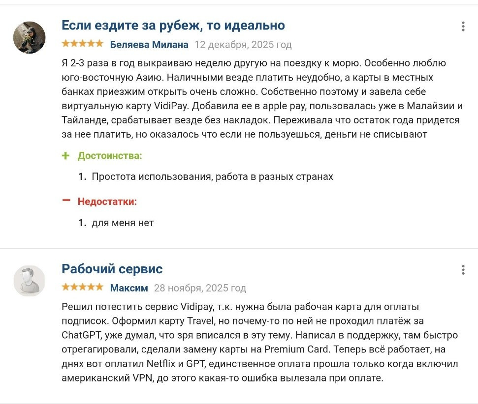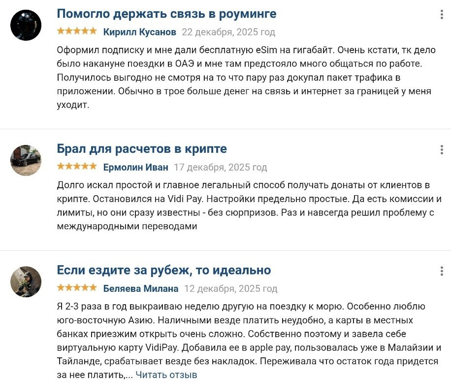 Для удобства travel-продукты сервиса VidiPay объединены в подписку. По сути — это пакет услуг, который упрощает пребывание за рубежом. С ним можно оплачивать покупки, бронировать транспорт и пользоваться интернетом сразу по выходу из самолета. Чтобы подключить VidiPay, достаточно открыть Telegram-бот и пройти регистрацию в системе. После этого открывается доступ к управлению кошельком. В том же интерфейсе доступна база знаний и служба поддержки. Согласно отзывам, стоимость сервиса VidiPay на начало 2026 года составляет 10 долларов. При оформлении подписки эта сумма возвращается на баланс виртуальной карты, поэтому первый месяц использования фактически получается бесплатным. В стоимость подписки включены: ● Travel card; ● eSim Vidi с бесплатным гигабайтом трафика; ● кешбэк в размере 5% в Telegram Stars; ● реферальная программа с бонусами за приглашение друзей. Для онлайн-платежей из России можно оформить Premium card. Она обойдется в 15 долларов, но 10 из них так же вернутся на счет. С этой картой можно оплачивать зарубежные сервисы (ChatGPT, Netflix и другие), совершать покупки в иностранных онлайн-магазинах и путешествовать. Для активных пользователей виртуальные карты и подписка на сервис VidiPay могут стать бесплатными. Если тратить в месяц от 500 долларов, то получится сэкономить на обслуживании, а расходы от 1000 долларов позволят не платить еще и за подписку. Это выгодно для тех, кто часто путешествует или любит шоппинг за границей. Одной из главных особенностей сервиса можно признать eSim Vidi. Она позволяет путешественникам общаться и выходить в интернет в более чем 150 странах мира. В пользовательских обзорах и официальных каналах проекта отмечают, что eSim Vidi помогает: В отзывах люди отмечают удобство такой сим-карты, ее мгновенное подключение и контроль из одного приложения. Люди говорят, что это дает определенную свободу, повышает комфорт на отдыхе и расширяет границы. По словам клиентов интернет с такой сим-картой работает стабильно и решает множество задач — от сообщений в мессенджерах до подтверждения брони. Перед активацией стоит учитывать, что eSim Vidi доступна только на современных гаджетах, которые поддерживают такой формат связи. Кроме того, пользоваться сим-картой можно только на одном устройстве. Перед поездкой лучше проверить, в каких странах работает eSim, чтобы избежать неудобств. В отзывах о платежной системе VidiPay преобладают позитивные впечатления. Кроме наличия eSim, пользователи отмечают удобство платежей и прозрачные тарифы. Клиенты хвалят возможность оплачивать зарубежные сервисы, например Chat GPT, или собирать донаты. Люди сообщают, что виртуальные карты успешно работают в Азии, Арабских Эмиратах и других популярных туристических направлениях. Очков сервису добавляет и простота регистрации, а также то, что все продукты работают внутри популярного мессенджера. Дополнительными плюсами выступают служба поддержки, а также реферальная программа и кешбэк. Последний можно получать за траты по карте и использовать для оплаты Premium-подписки в Telegram. Сугубо отрицательных отзывов о сервисе VidiPay мало. В основном пишут про мелкие недостатки или ограничения. Например, некоторым пользователям не нравится, что за каждую операцию берут комиссию, а чтобы корректно добавить карту в Apple Pay, нужен VPN. Явная критика встречается всего в одном кейсе. Его автор пишет про неудачную тра