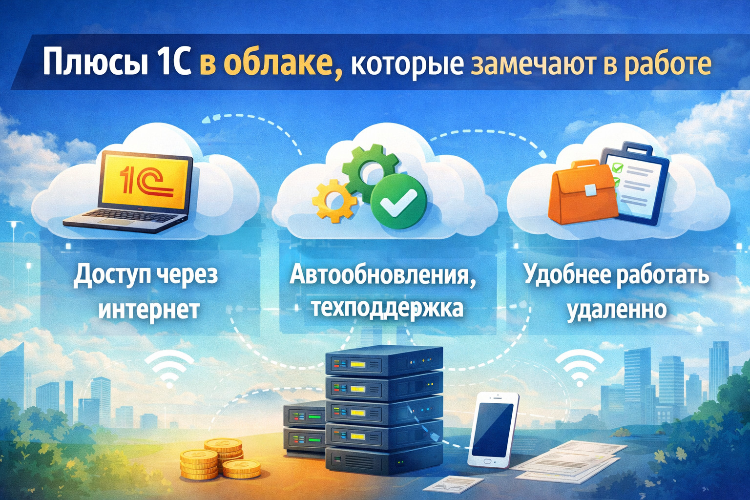 1С облачная бухгалтерия — это уже не редкий сценарий, а способ работать в 1С через интернет без привязки к одному компьютеру. Для бизнеса ценность здесь не в самой «облачности», а в более спокойной организации работы: проще зайти в базу, проще подключить сотрудников, меньше технической рутины и меньше зависимости от локальной инфраструктуры. Это и есть то, что 1С выделяет среди преимуществ Фреш: доступ через интернет, веб-клиент, готовая облачная среда и приложения для бухгалтерского учета.