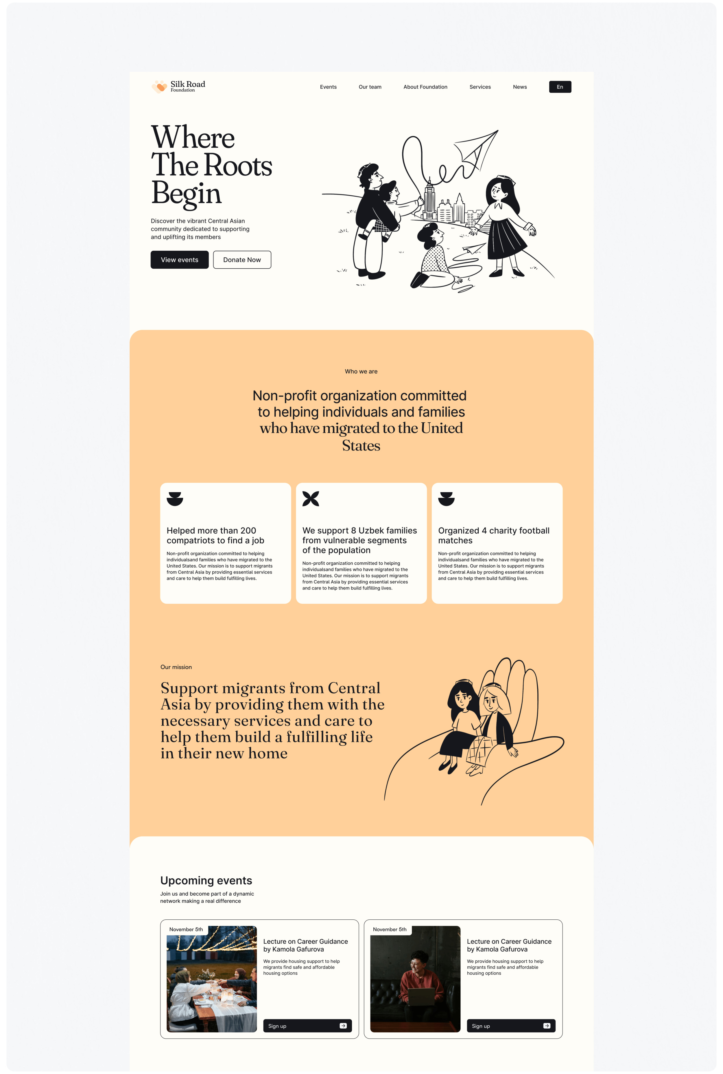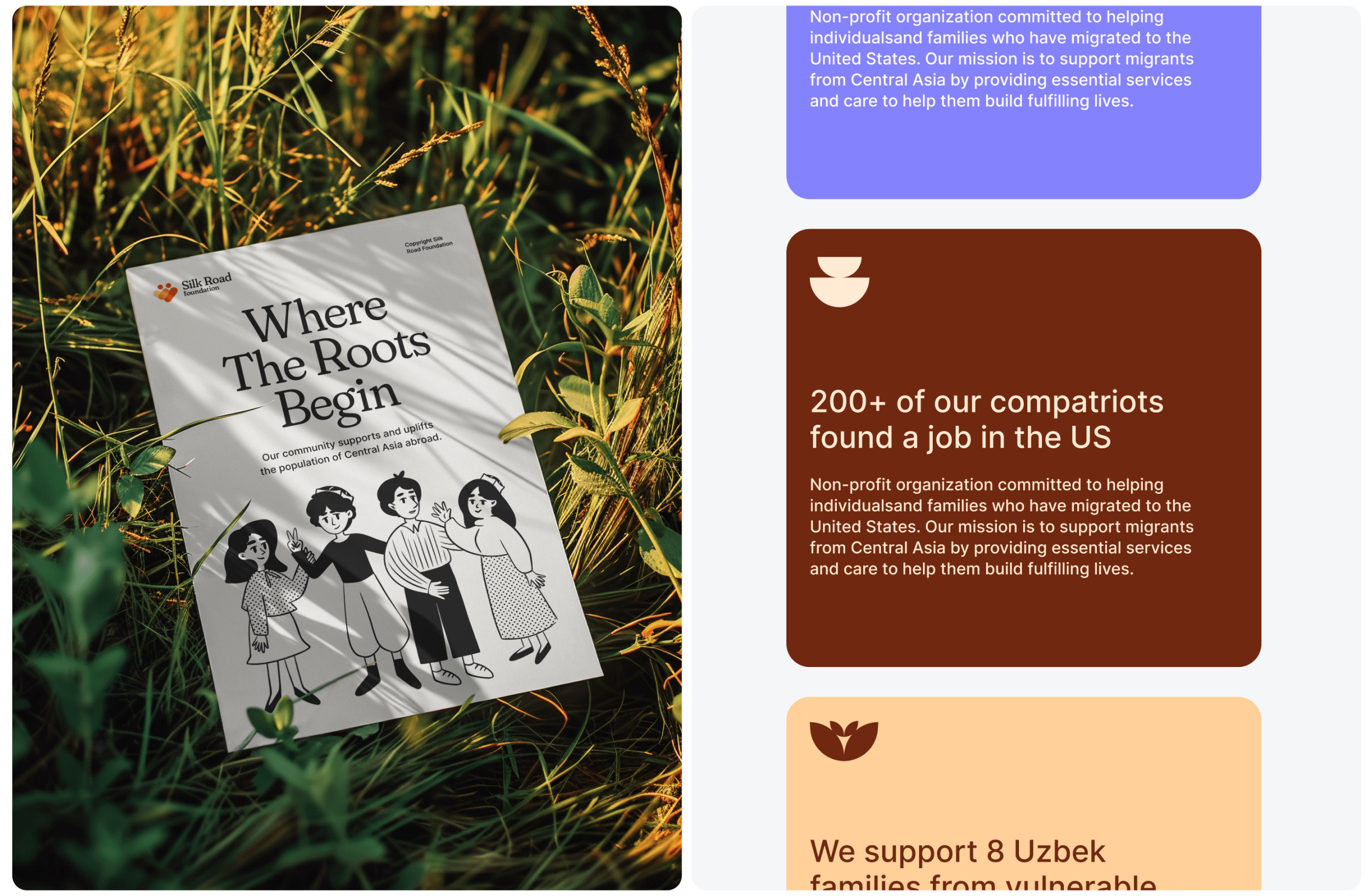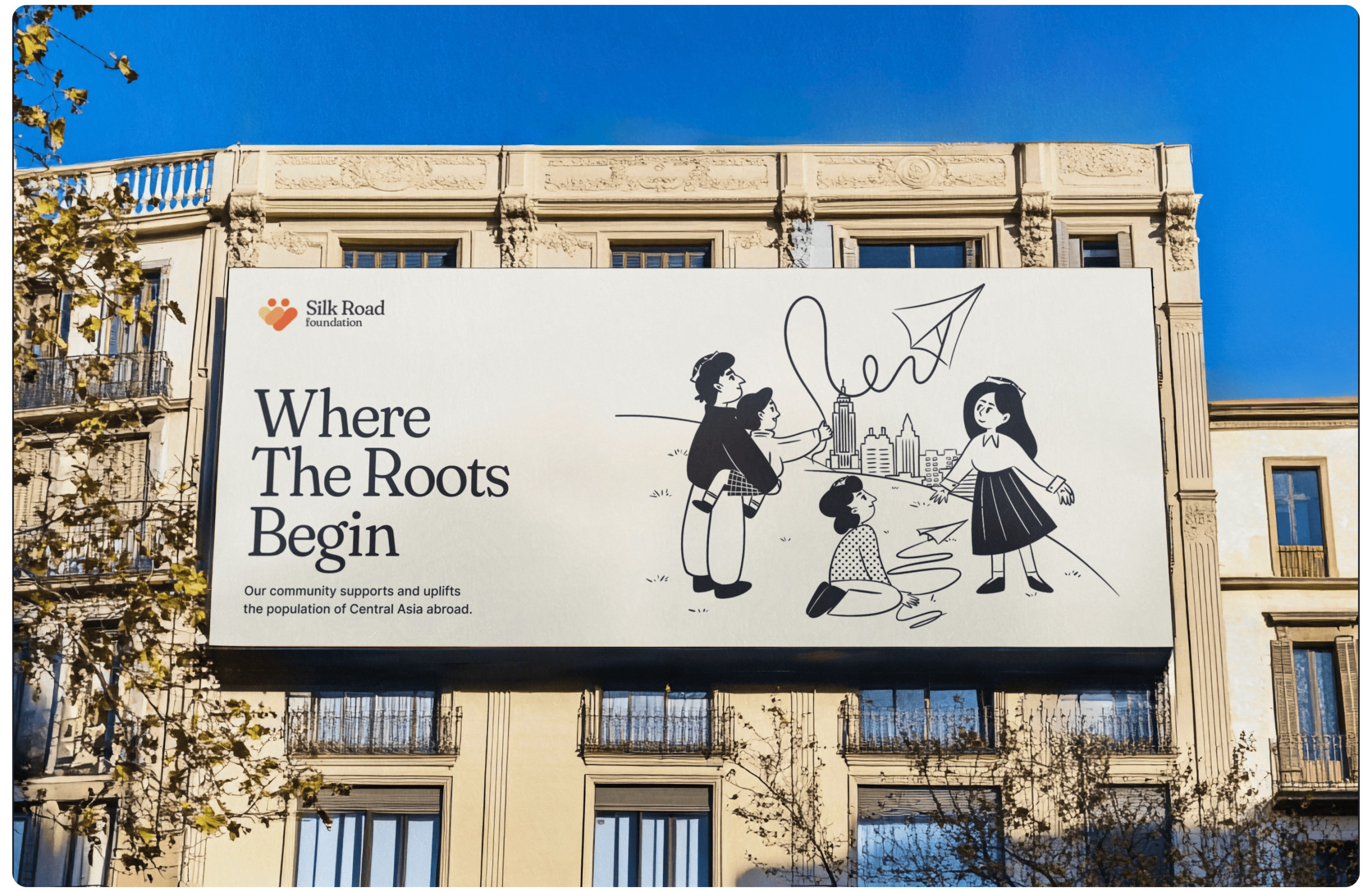 Основной вызов заключался в том, чтобы создать визуальный стиль, который будет говорить с аудиторией на уровне эмоций. Мы должны были сделать бренд теплым и близким для тех, кто нуждается в помощи фонда, но в то же время профессиональным и привлекательным для доноров, волонтеров и партнеров. Важно было подчеркнуть уникальность Silk Road Foundation: его связь с культурными корнями Центральной Азии, его миссию объединять людей и помогать им в новом обществе, создавая мост между традициями и современностью. Мы начали с глубокого погружения в миссию и культурный контекст фонда. Анализ традиционных узоров, национальной одежды, сцен из повседневной жизни Центральной Азии дал нам множество идей. Вдохновляющими стали образы семьи, дружбы, совместных застолий, которые идеально передают ценности фонда. Центральным элементом нового стиля стал обновленный логотип. Мы сохранили преемственность с предыдущей версией, но наполнили его новым смыслом. Логотип теперь включает силуэты людей, образующих сердце — символ заботы, единства и взаимной поддержки. Графика и иллюстрации выполнены в технике лайн-арта. Эти изображения не просто украшают стиль, а рассказывают истории: семейные обеды, игры детей с воздушным змеем, дружеские встречи. Все это создаёт визуальную теплоту, отражающую миссию фонда. Мы добавили детали, такие как тюбетейки и узоры, чтобы подчеркивать культурное богатство региона. Цветовая палитра стала теплой и уютной, усиливая эмоциональную связь с брендом. Мягкие оттенки создают ощущение доверия и поддержки. Типографика, минималистичная и лаконичная, помогает выделить основные посылы. Слоган «Where the Roots Begin» стал связующим звеном концепции, напоминая о важности сохранения корней, даже находясь вдали от родины. Обновленный визуальный стиль стал отражением миссии Silk Road Foundation. Он сделал бренд ближе и понятнее для подопечных фонда, усилив их доверие и эмоциональную связь с организацией. Люди, обратившиеся за помощью, теперь видят, что этот фонд действительно понимает и разделяет их ценности. Для доноров и волонтеров новый стиль стал символом профессионализма и глубокой миссии фонда. Благодаря обновленной визуальной идентичности фонд смог привлечь больше внимания к своим инициативам, установить новые партнерства и расширить свою поддержку. Каждый элемент, от логотипа до цветовой палитры, стал частью большой истории о заботе, тепле и культурном наследии. Этот проект доказал, что дизайн — это не только визуальная оболочка, но и инструмент, который может вдохновлять, объединять и укреплять миссию бренда. Silk Road Foundation продолжает помогать людям, а их новый стиль стал тем самым мостом между традициями и современностью, который помогает достучаться до сердец своей аудитории. Наше агентство гордится этим проектом и тем, что мы смогли стать частью такой значимой истории.