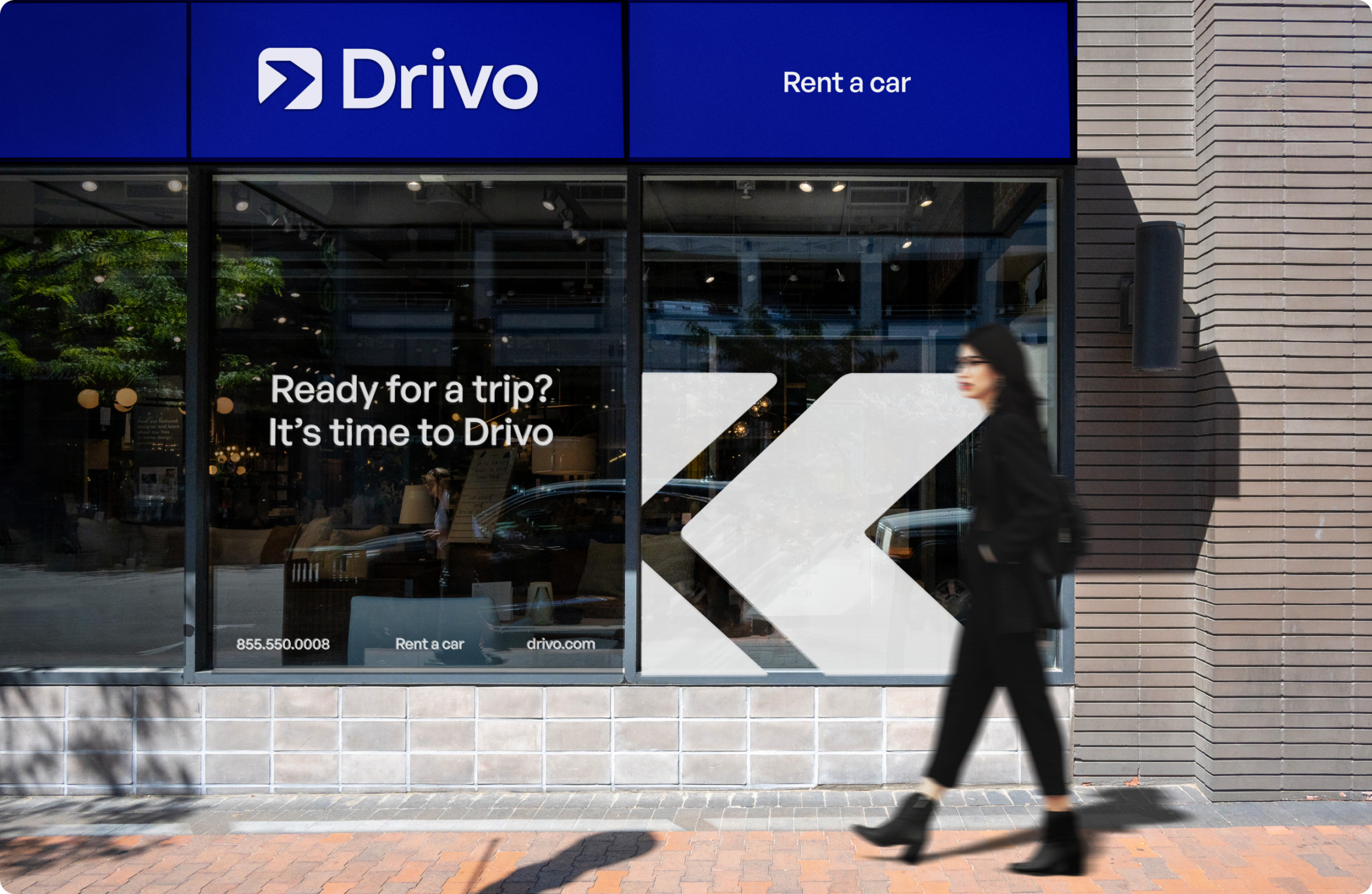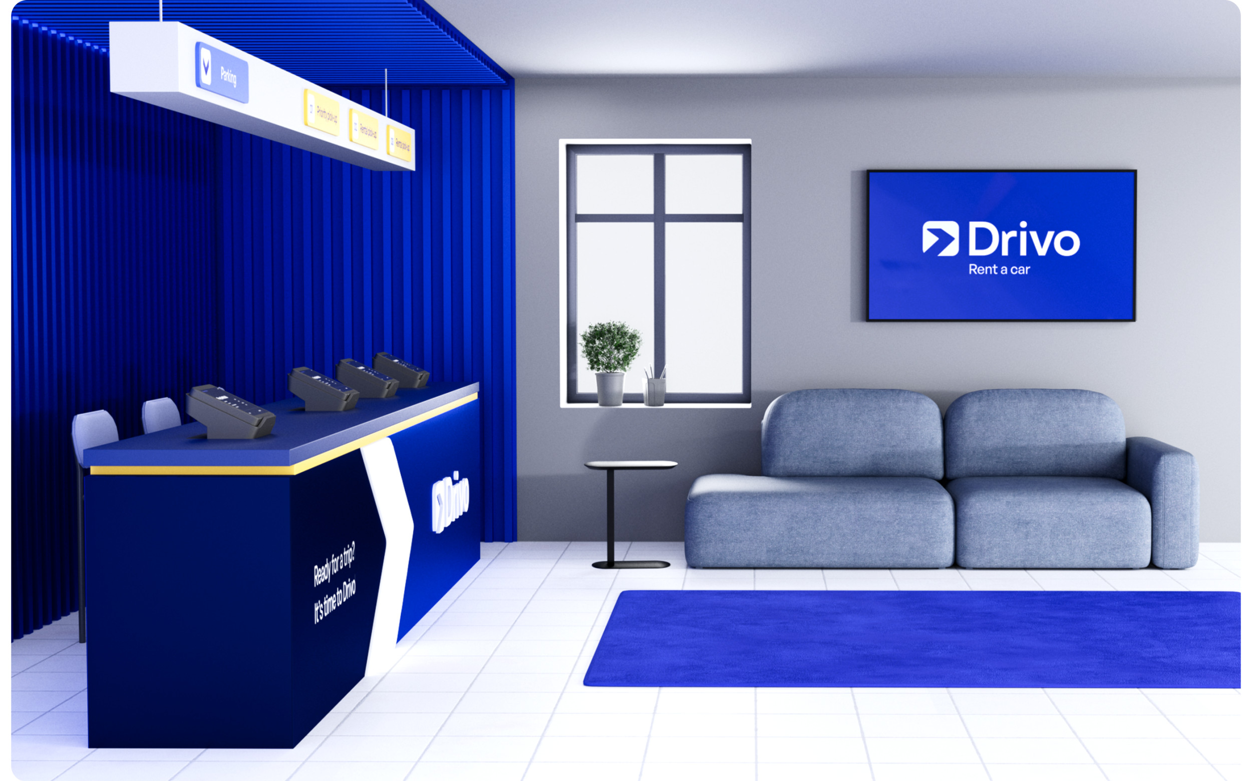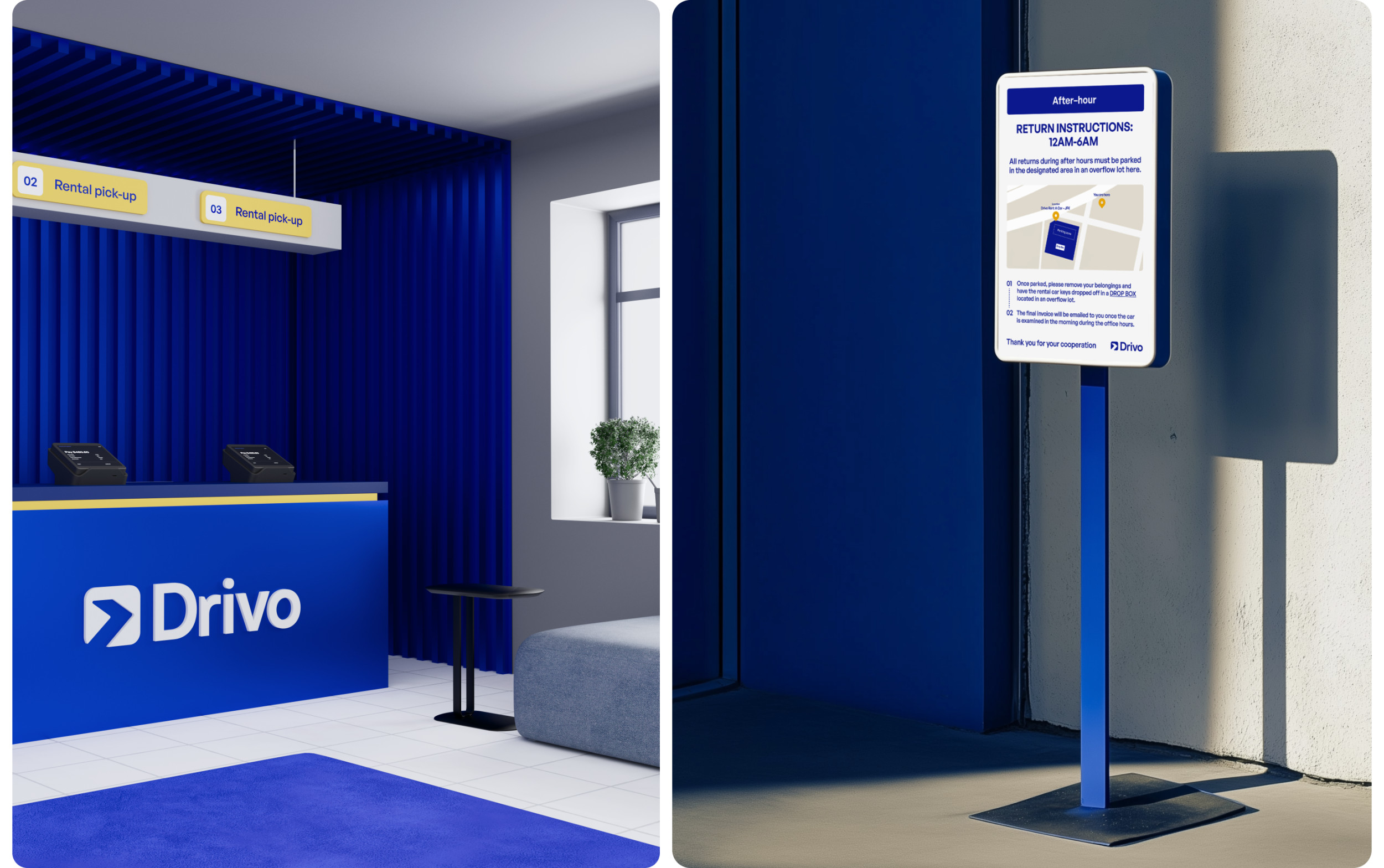 Мы начали с глубокого анализа. Исследовали все точки контакта: офлайн-стойки, сайт, соцсети, приложение. Стало очевидно: у Drivo отсутствует единый пользовательский опыт. В одной локации — терминал в фирменных цветах, в другой — нейтральная стойка без единого логотипа. Мы провели конкурентный анализ — от международных агрегаторов до локальных дилеров. Большинство фокусировались на цене и ассортименте. Но у Drivo был потенциал стать технологичной платформой, которая решает задачу клиента быстро, понятно и без стресса. Вместе с этим мы провели серию интервью с клиентами и менеджерами, определили основные pain points: путаница в локациях, разные стандарты обслуживания, несогласованная визуальная идентичность. На основе анализа мы пришли к выводу: бренду нужно выстроить целостную экосистему. Обновить визуальный стиль, выровнять коммуникации и создать комфортный пользовательский путь — от первой точки касания до возврата автомобиля. Мы отказались от идеи продавать Drivo как «прокат авто». Вместо этого сделали акцент на скорости, удобстве и заботе о клиенте. Было сформулировано новое позиционирование: Drivo — это не просто рентал, а платформа для передвижения, которая делает процесс аренды максимально простым и технологичным. Tone of voice — дружелюбный, но уверенный. Мы говорим с клиентом на его языке, объясняем сложное простыми словами, оставаясь при этом современным и понятным брендом. Это позиционирование легло в основу всех визуальных и вербальных решений: от сайта и соцсетей до стоек аренды и униформы сотрудников. Создание нового визуального языка началось с палитры: глубокий синий стал основным цветом — как символ надежности и движения. В паре с ним — чистые линии, светлые акценты и типографика, подчеркивающая современность. Мы переработали логотип, объединив элементы движения и архитектуры города. Визуальные метафоры стали связующим звеном между физическим пространством Нью-Йорка и цифровым опытом аренды. Каждая точка аренды стала частью единой системы. Мы внедрили визуальную навигацию, разделили процесс аренды на три зоны — приоритетный pick-up, обычный rental и возврат. Благодаря визуальным элементам, цифровым табло и инструкции, взаимодействие с брендом стало простым и приятным. Ранее digital-присутствие Drivo не отражало сути бренда. Мы пересобрали визуальный стиль для соцсетей: яркие 3D-объекты, прозрачные текстуры, узнаваемые паттерны. Контент стал ближе к пользователю. Мы рассказали реальные истории: «как снять авто за 5 минут», «что делать, если нет SSN», «какие машины подойдут для семьи». Вместо стоковых фото — честные Reels с участием клиентов и сотрудников. Отдельный фокус — Instagram и Facebook. Мы внедрили формат сторителлинга, использовали личный тон, оживили коммуникацию. Сайт — ключевая точка контакта. Мы переработали структуру по модели AIDA: захват внимания, раскрытие ценности, объяснение условий, быстрый CTA. Добавили фильтры, страницы под кредитные программы, интеграцию с CRM. Оптимизировали скорость, упростили путь от главной до финального экрана бронирования. Дизайн будущего мобильного приложения адаптировали под новый визуал и UX — seamless-опыт с любого устройства стал обязательным стандартом. Форма сотрудников, брелоки, буклеты, скидочные карты — каждая деталь говорит: Drivo — это про заботу. Мы сделали визуал консистентным: всё говори