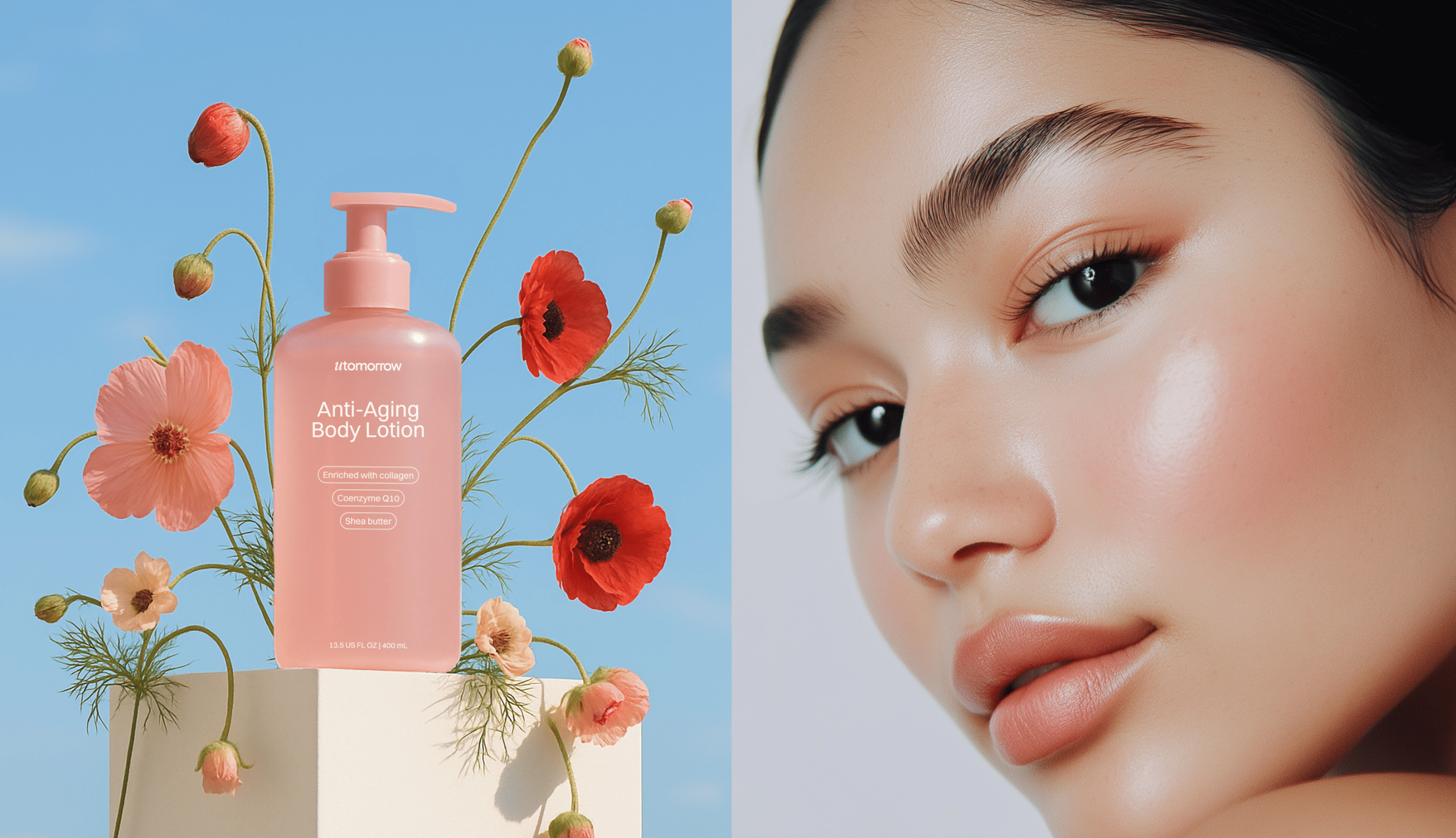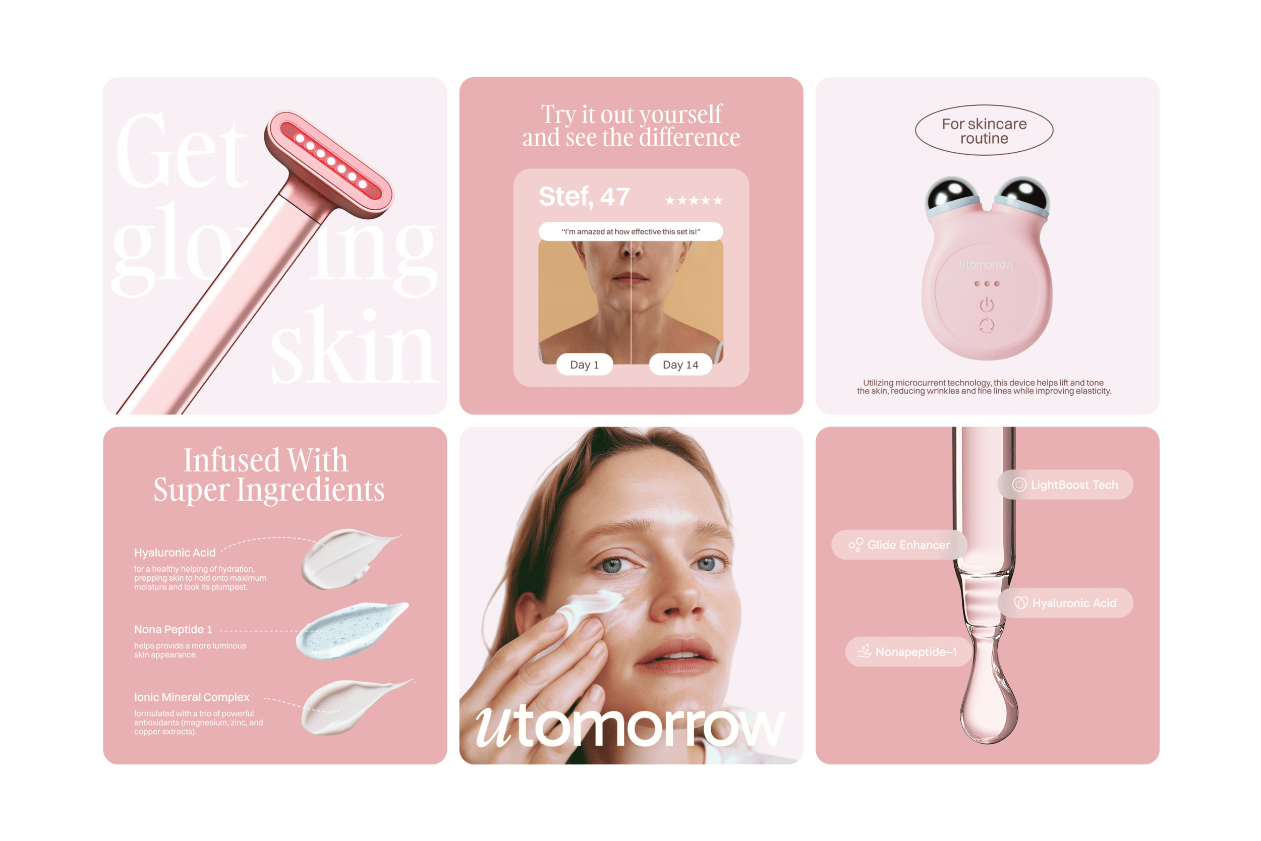 Utomorrow — бренд уходовой косметики и бьюти-гаджетов, ориентированный на женщин 35–50 лет. Целевая аудитория — те, кто устал от давления индустрии и хочет заботиться о себе без уколов, фильтров и чудо-обещаний. Честный уход, 15 минут в день, спокойствие и принятие.
