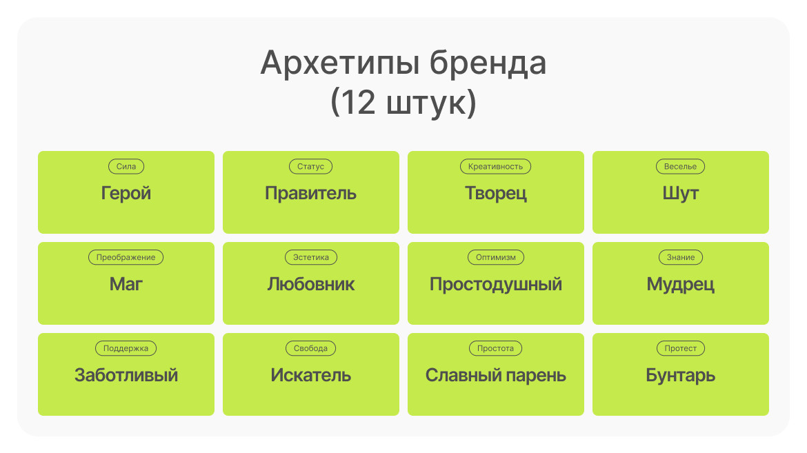 Один из самых точных способов задать такой характер — через архетип. Система из 12 ролей, которую придумал Юнг ещё сто лет назад, до сих пор помогает брендам звучать по-человечески и быть на одной волне со своей аудиторией.