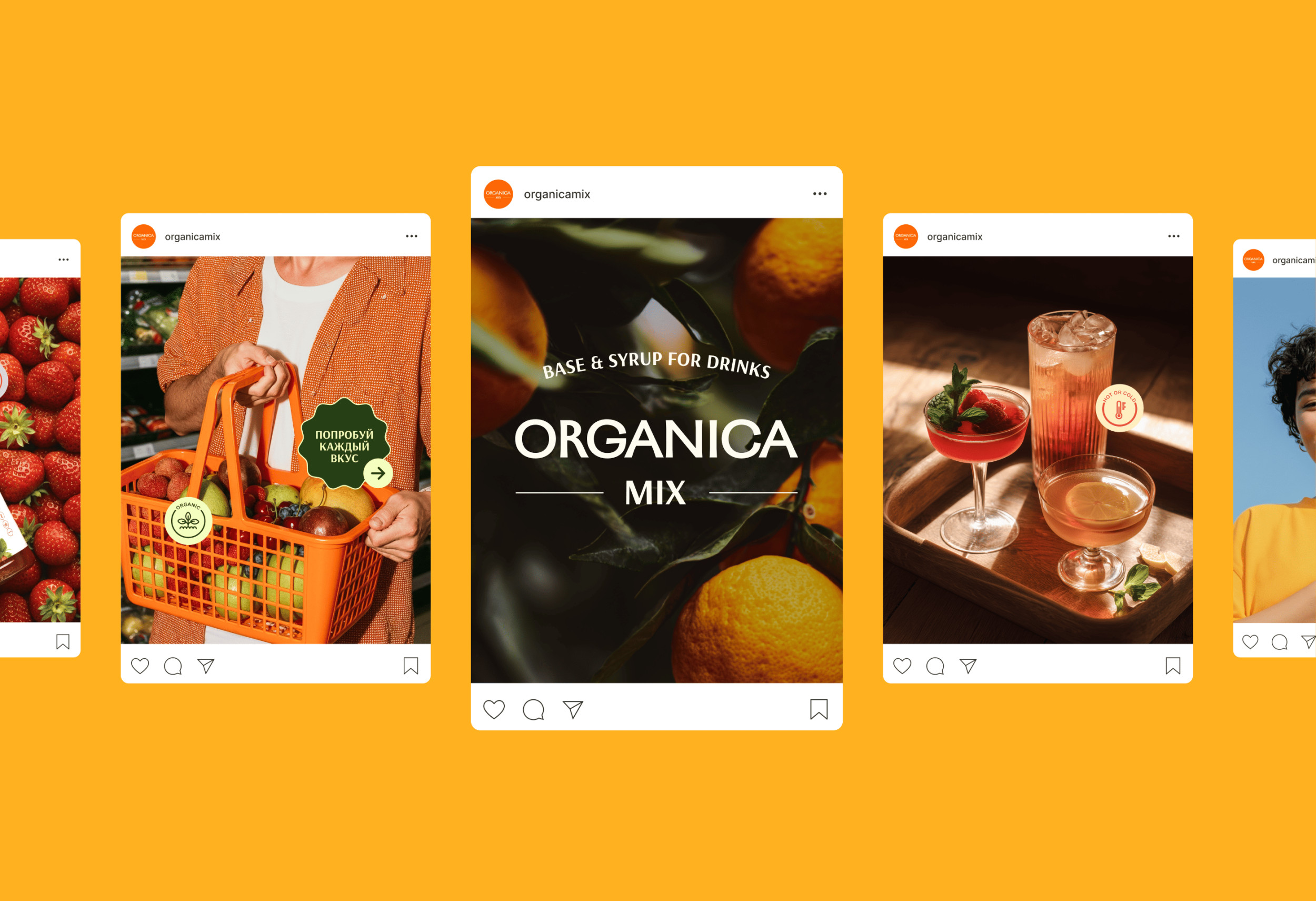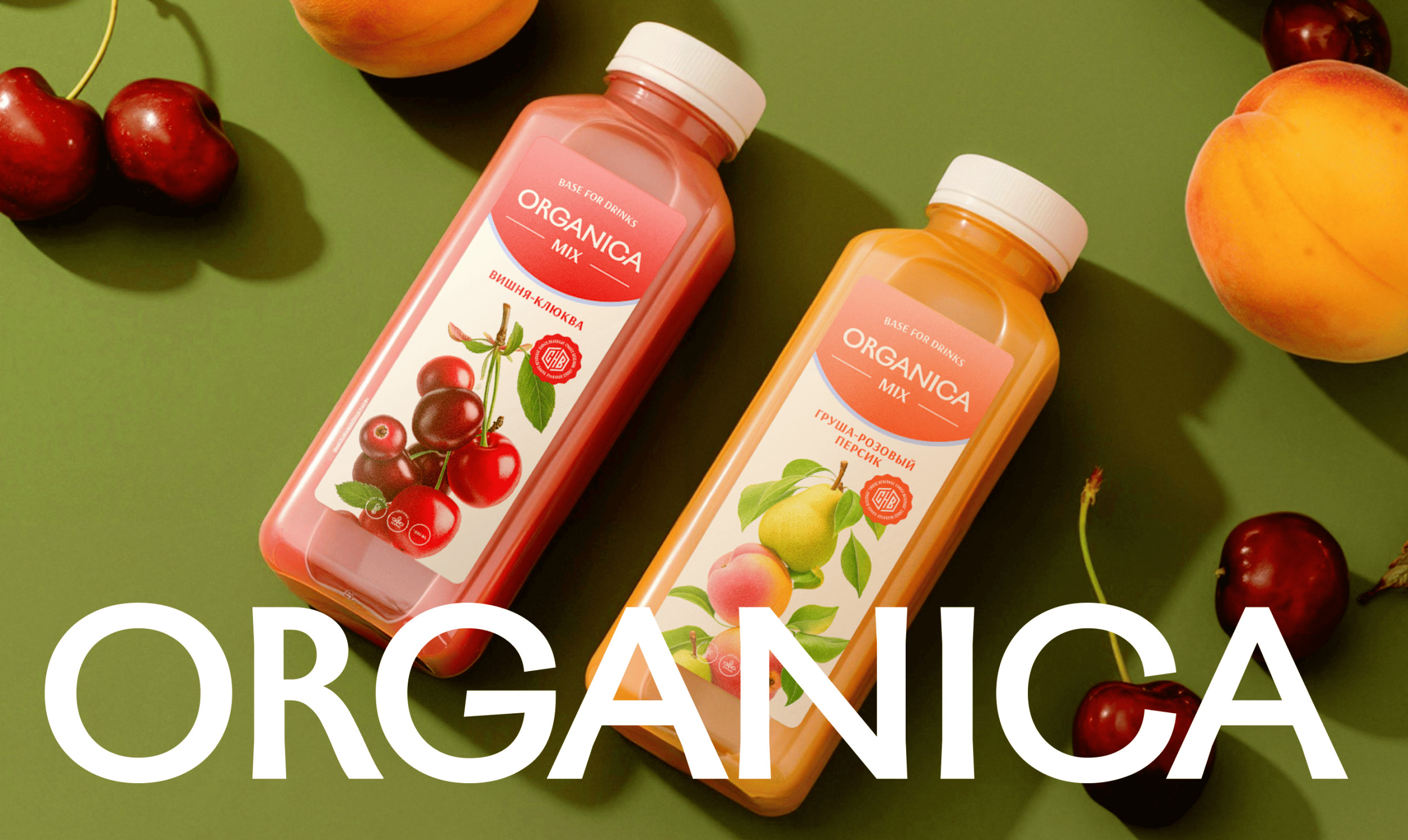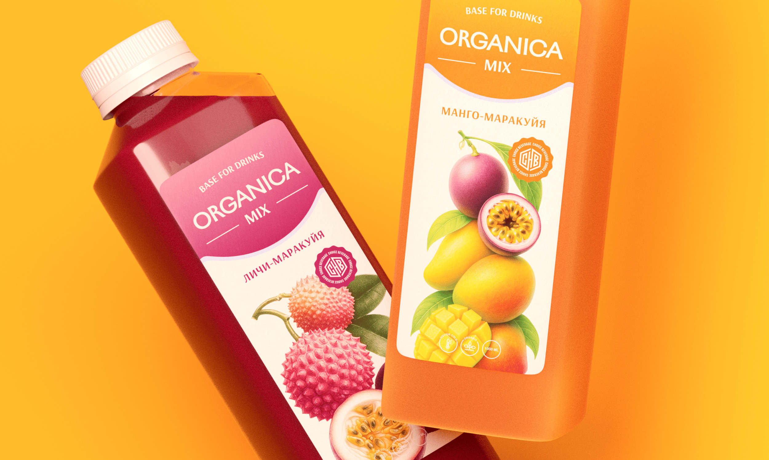 — добавление новых позиций не должно требовать переработки всей линейки Этот этап задал архитектуру будущего решения. Далее мы перешли к разработке новой визуальной системы. Ключевым элементом стало цветовое кодирование. Каждый вкус получил доминирующий цвет, связанный с основным ингредиентом. Это позволило упростить навигацию по линейке и снизить когнитивную нагрузку при выборе продукта. Мы переработали бренд-зону и логотип, сделав их более устойчивыми и универсальными. Их задача — не перетягивать внимание, а удерживать упаковку в едином поле, независимо от количества SKU. Дополнительно были внедрены графические элементы и клеймы, которые помогают структурировать информацию и делают упаковку более читаемой. В результате система стала работать как конструктор: понятная основа + управляемая вариативность. После того как была собрана базовая система, мы перешли к самому заметному уровню — иллюстрациям. Задача заключалась в том, чтобы усилить восприятие вкуса и сделать упаковку более выразительной. При этом важно было не разрушить системность. Для каждого SKU были разработаны композиции с акцентом на сочность и натуральность. Фрукты выступают не просто как иллюстрации, а как ключевой визуальный элемент, который помогает быстро идентифицировать продукт. Мы сознательно сделали их более крупными и выразительными, чтобы упаковка не терялась среди большого количества позиций. Это дало баланс: с одной стороны — единая система, с другой — достаточная вариативность, чтобы линейка не выглядела однообразной. Вместо точечного редизайна отдельных позиций Organica Mix получил полноценную упаковочную систему для большой и растущей линейки. Новая система: — масштабируется без потери качества