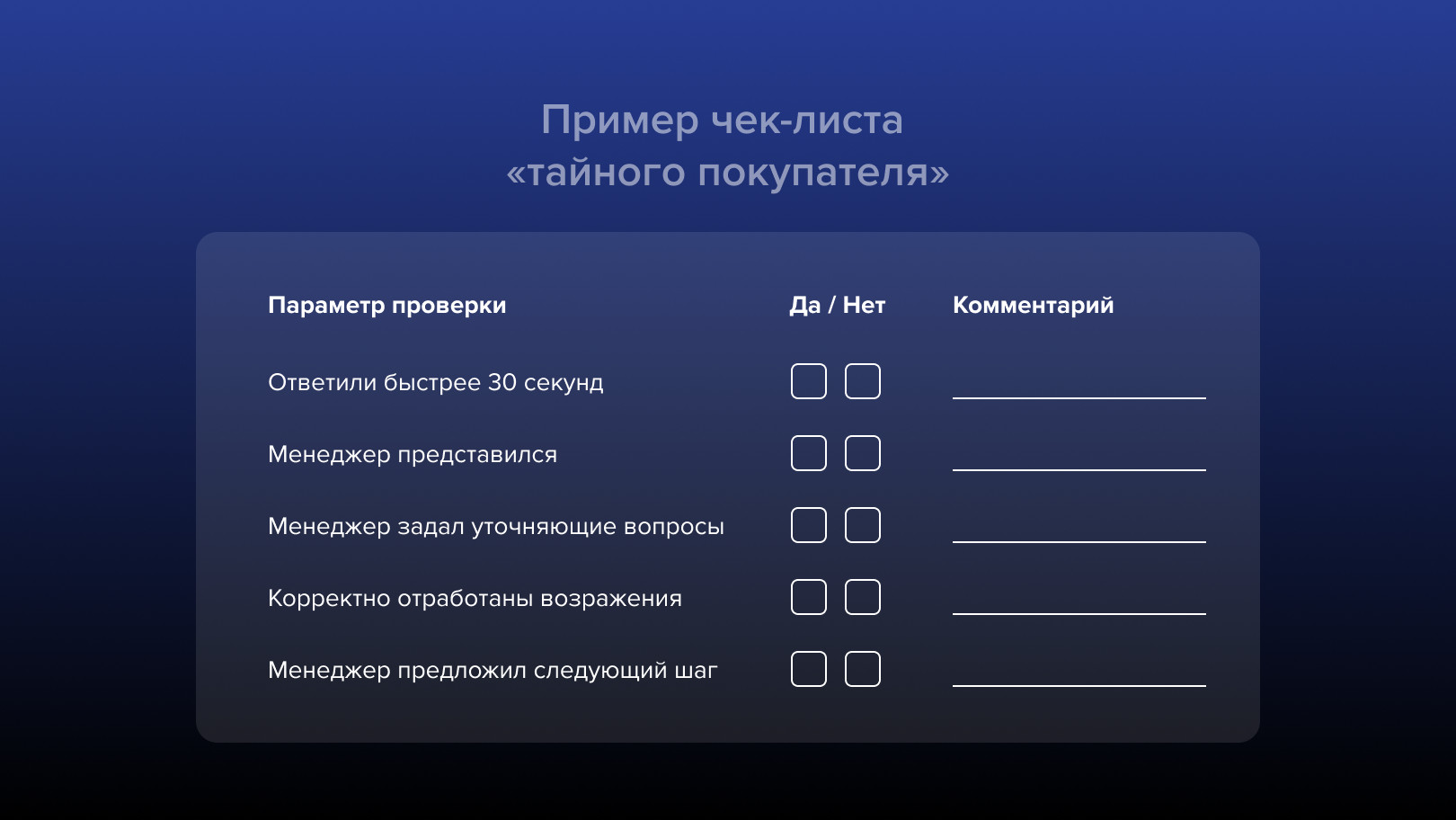 Тестовый звонок помогает оценить скорость ответа, приветствие, умение выявлять потребность и работать с возражениями.Онлайн-заказ выявляет сбои на сайте и в доставке.