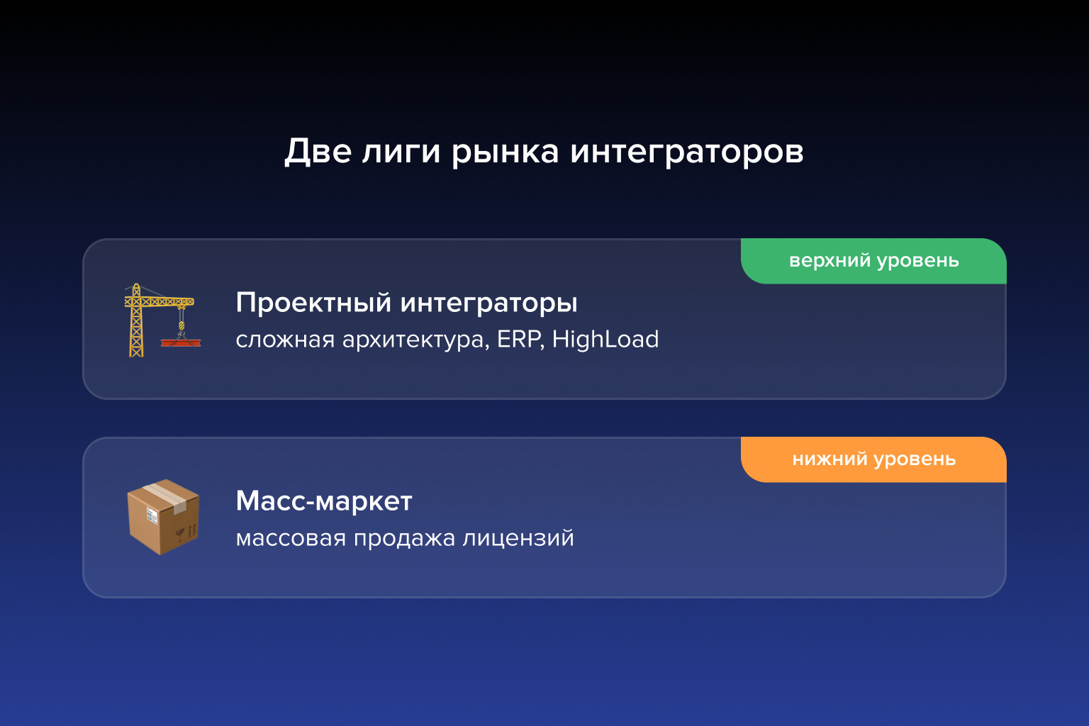 Чтобы не ошибиться, важно понимать, как условно разделен партнерский рынок: на две группы. С одной стороны — масс-маркет (около 8000 компаний РФ), которые закрывают задачи простой продажи лицензий и базовой настройки по техническому заданию. С другой — высшая лига проектных интеграторов, способных внедрить 1С:ERP, в том числе для работы с высокими операционными нагрузками (HighLoad).