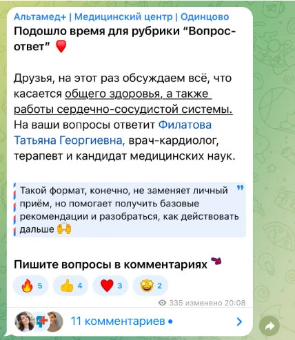 Во-первых, так как часть аудитории не стала разбираться с vpn и выбрала именно телеграм для активного общения, а блогеры адаптировались и создали там свои каналы. Поэтому телеграм сейчас — это способ охватить большее количество людей, входящих в ЦА клиники.