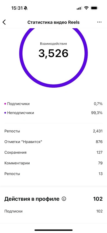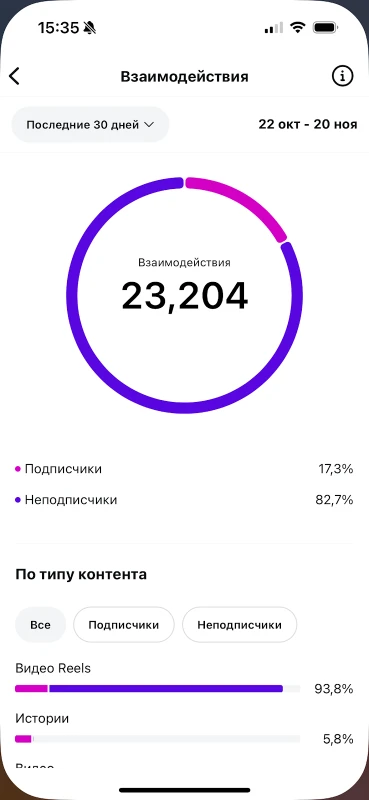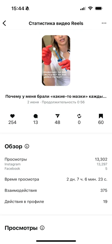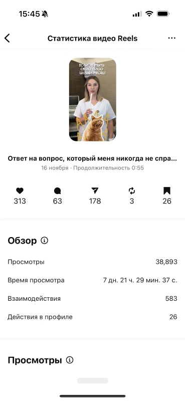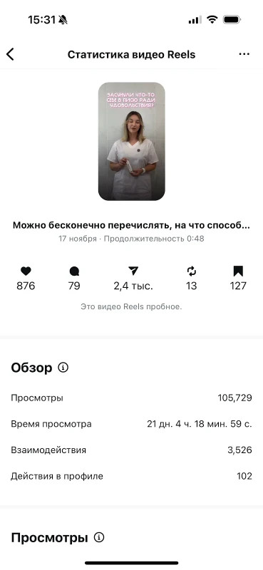 Далее новые ролики выходили, но набирали скромные охваты. Число подписчиков перестало расти, а обращений стало меньше. Врач обратилась к нам с чётким запросом: «Я хочу писать тексты и вести сторис сама, но мне нужны идеи, сценарии и монтаж для Reels. Хочу, чтобы они выходили регулярно, приводили новых подписчиков, и как можно больше людей узнали об интимной пластике». В отличие от комплексного ведения соцсетей (в рамках которого мы обычно сотрудничаем с врачами и клиниками), в этом проекте мы работаем по гибридной модели. Мы как агентство: Клиент: Такой формат подходит не всем. Но благодаря максимальной включённости врача, её любви к своему делу, открытой коммуникации с аудиторией и харизме ведение соцсетей может стать успешным и с таким делегированием задач. И это — идеальная связка: мы создаём стратегию → клиент оживляет её своим характером → Reels работают! Главная проблема после случайно завирусившихся Reels — отсутствие системности. Поэтому мы подошли к работе с контентом, учитывая три составляющие. ➊ Баланс контента Чтобы не выгорала аудитория и не падали охваты, мы держим баланс между: Юмор и лёгкость работают в интимной тематике особенно хорошо: снимают напряжение и делают врача «своим человеком». ➋ Сериальные рубрики Мы ввели несколько постоянных направлений: Рубрики формируют у аудитории привычку возвращаться к блогу и желание далее наблюдать за контентом. ➌ Аналитика каждого ролика Мы отслеживаем: Без аналитики невозможно системно создавать контент, который будет интересен целевой аудитории врача, утеплять её и прогревать к записи. Уникальность стратегии в том, что мы могли использовать смелые, цепляющие посылы — и это стало конкурентным преимуществом. Не все врачи могут позволить себе острые, яркие заголовки без фильтра. Но в этом проекте именно личность и подача врача дали нам пространство для более дерзкого, честного и цепкого контента. Мы использовали формулировки, которые отражают её стиль общения, снимают напряжение в интимной тематике и идеально ложатся в позиционирование. Именно такая подача: живая, настоящая, не академичная — и дала возможность создавать заголовки, которые цепляют с первых секунд и «вытаскивают» ролики в рекомендации. Например, наши реальные хук-заголовки: Такая подача: Такая смелость возможна только тогда, когда личный бренд врача позволяет это. В нашем случае это стало одним из факторов вирусности. За время совместной работы несколько рилс попали в рекомендации широкой аудитории и набрали 300+ тысяч просмотров. Все они принесли новую волну подписчиков. Пример № 1 — «про персик» Видео о том, как в интернете называют женские гениталии: «персик», «щавель», «ракушка». Ролик набрал более 400 000 просмотров и принёс +600 подписчиков. Почему видео сработало: Пример № 2 — «Что делать, если засунули туда что-то не то» Тему мы изначально планировали сделать строго полезной, но врач добавила несколько фраз в своей фирменной манере — и ролик стал гораздо живее. Результат на середину ноября: 150+ тысяч просмотров (ролик продолжает еще вируситься) и приток новых подписчиков (пока что +86 человек).Этот ролик мы параллельно добавили через функцию «пробный период», и он тоже сразу начал набирать просмотры и принёс отдельно ещё +100 подписчиков. Почему это видео сработало: Статистика видео из ленты и пробного пери